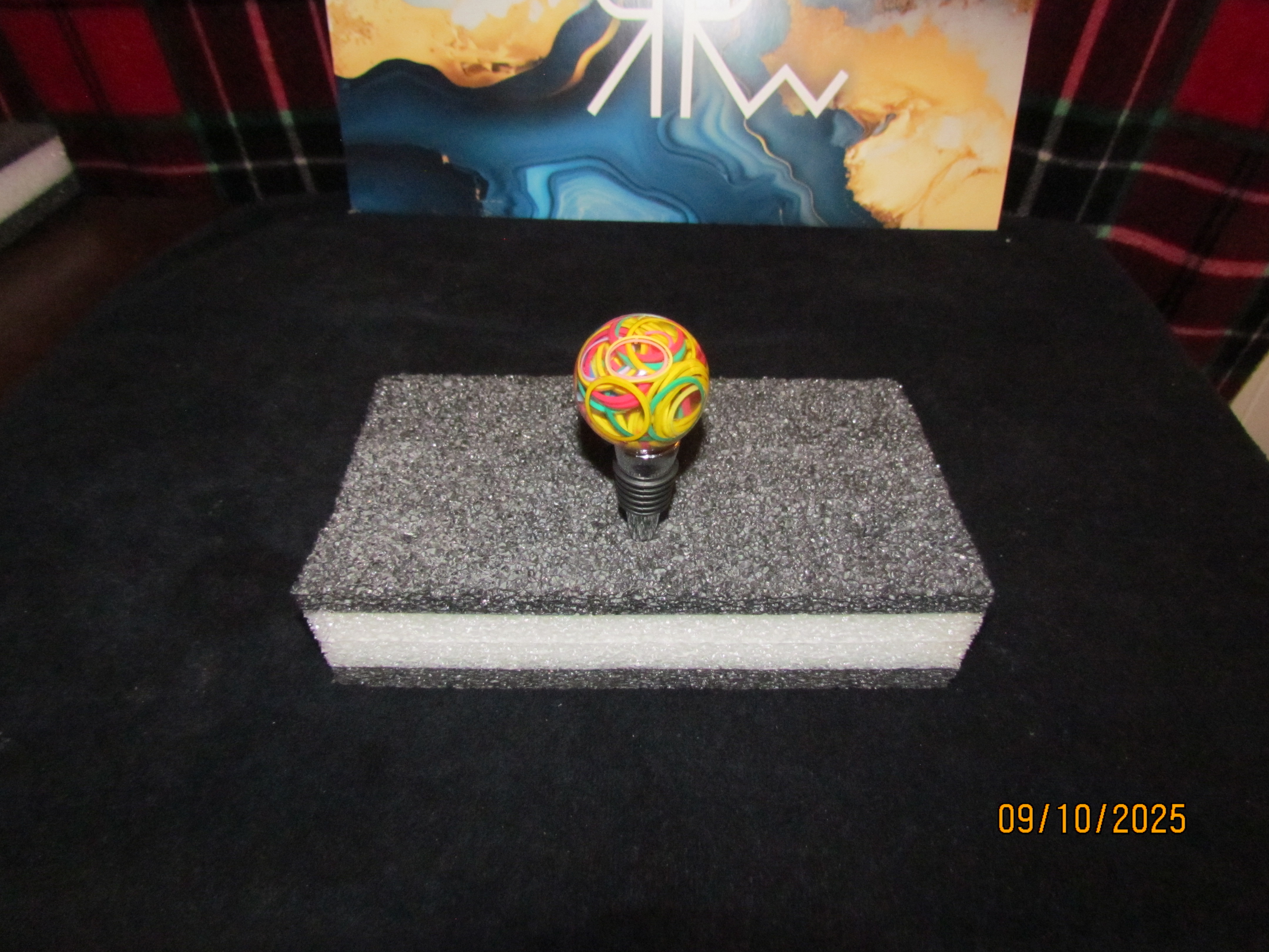 this bottle stopper is clear with rubber bands inside of it. it is round in shape.