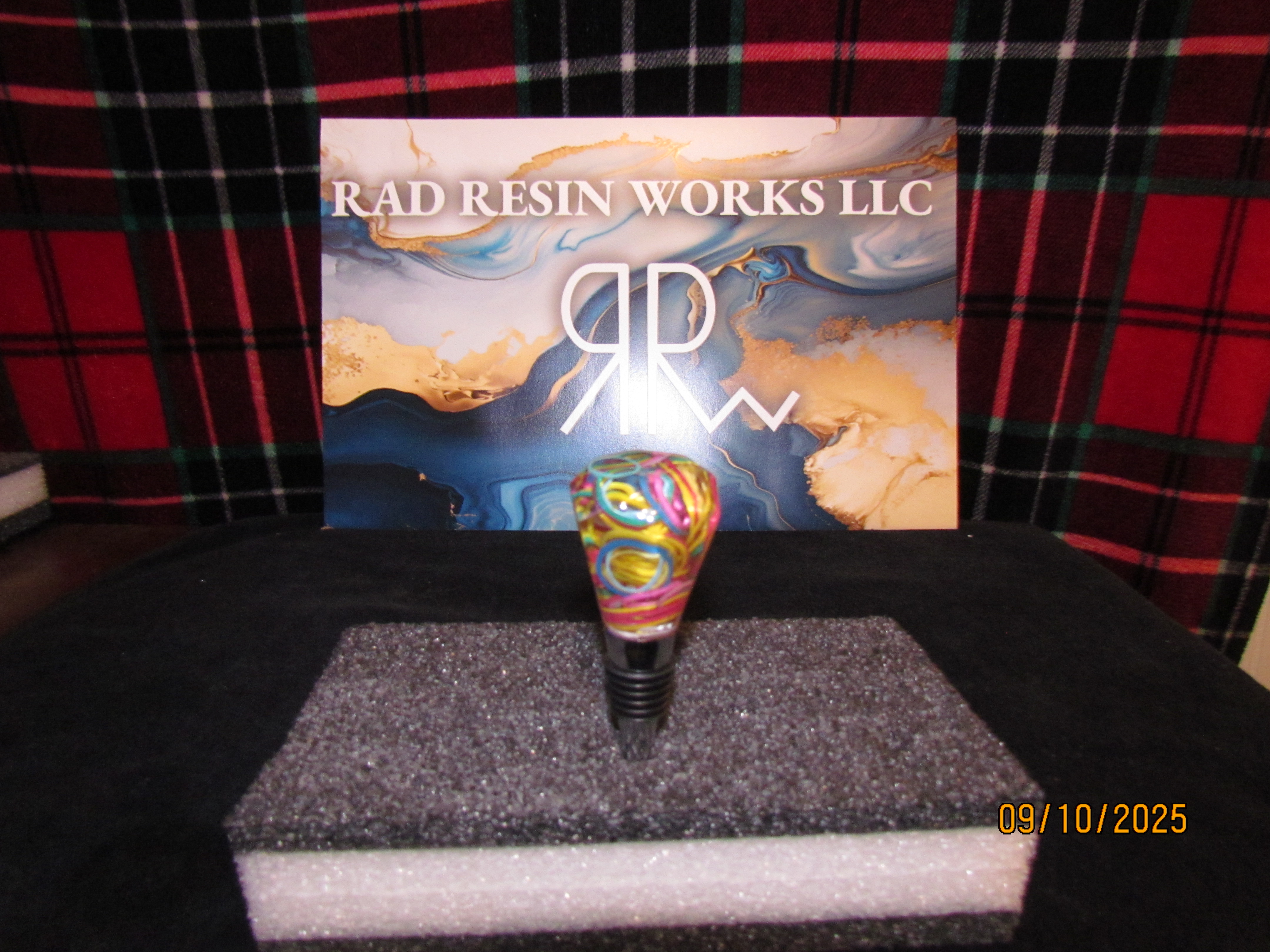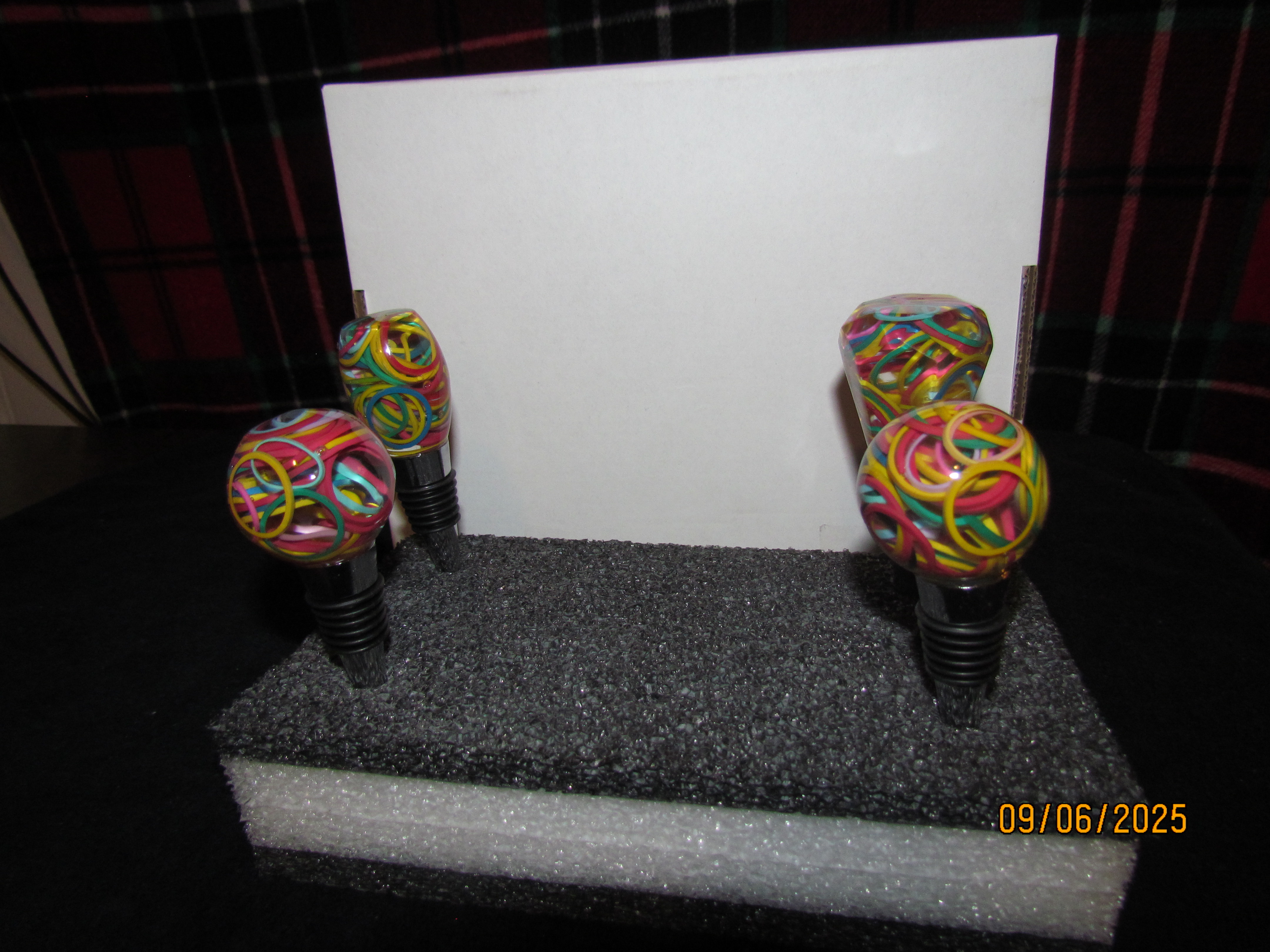 this bottle stopper is clear with rubber bands inside if it. it is diamond shaped.
