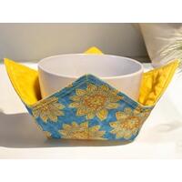 Bowl Cozy -Blue Floral Bees, reversible, microwaveable