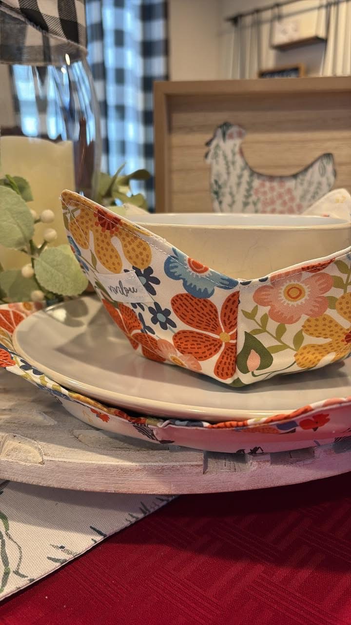 these bowl cozies are great for the microwave. Perfect for warming leftovers, soups, chilis.. no more burning fingers while removing your bowl.. even great as hot pads. Made with 100% cotton including an inside batting. 3 layers. Set of 2 reversible bowl cozies