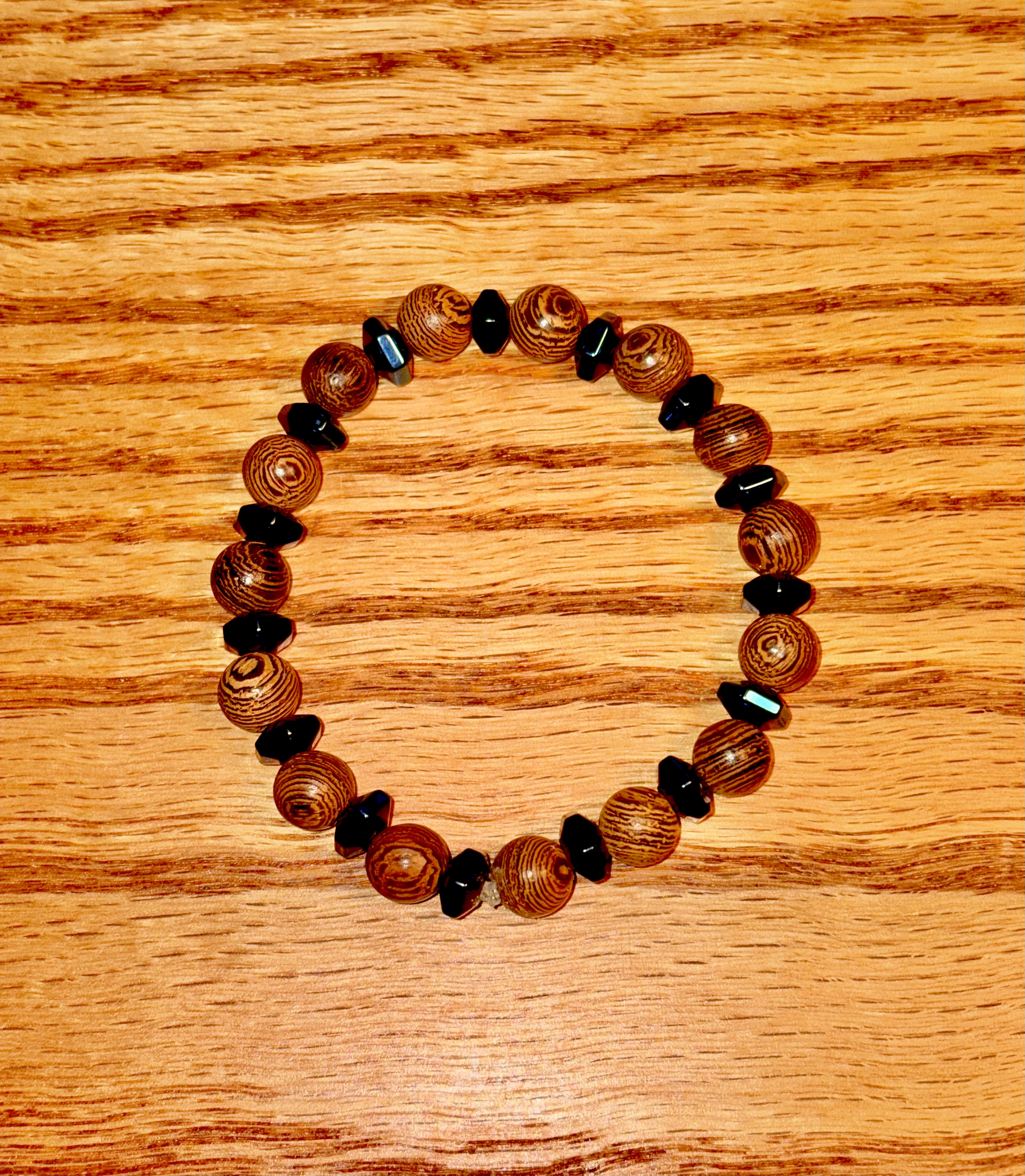 This piece is strung on a durable elastic cord, providing a secure and comfortable fit for both men and women. It's a versatile accessory that easily transitions from casual to slightly more formal wear.