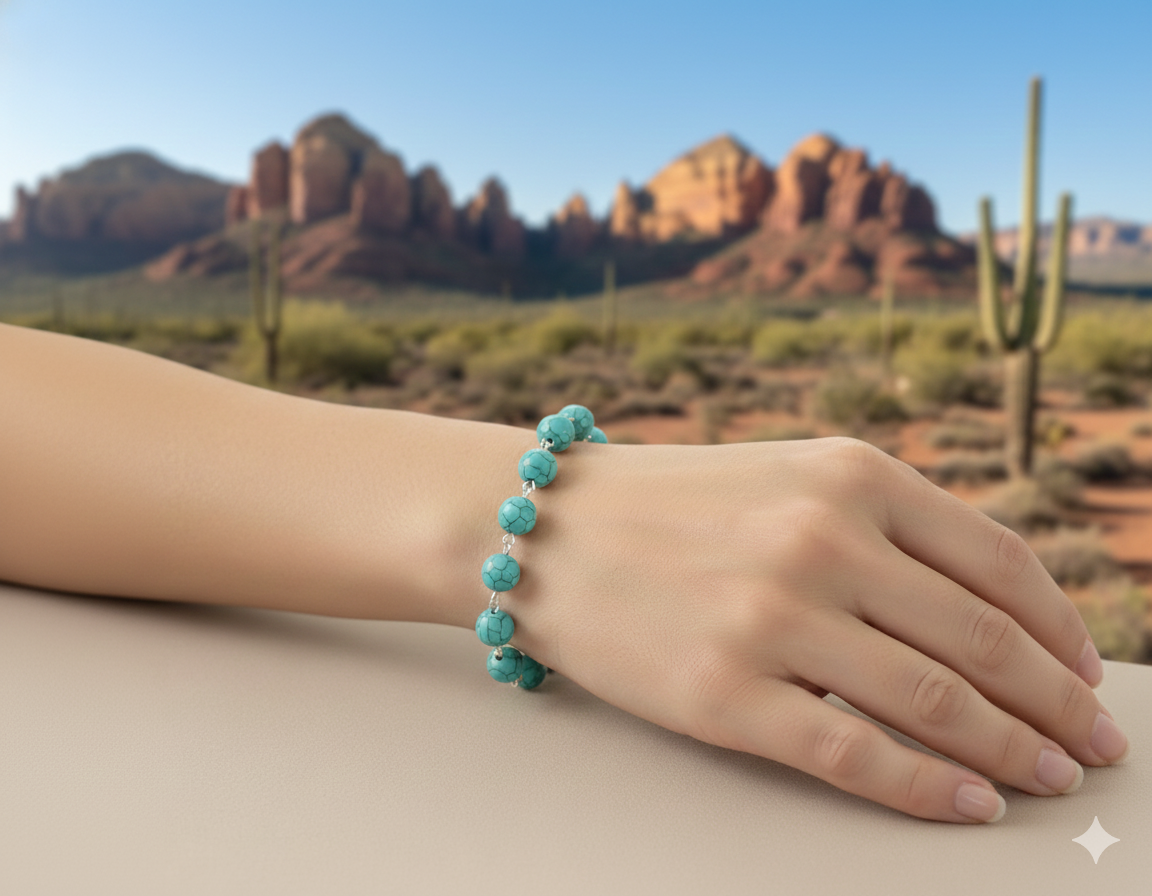 This attractive bracelet features a continuous row of smooth, 10mm round turquoise-colored beads. Each bead is unique, showcasing natural-looking veins and matrices in a darker shade, giving the piece an organic and authentic feel. The beads are individually linked with silver-toned wire, creating a fluid and flexible design that drapes beautifully on the wrist.