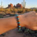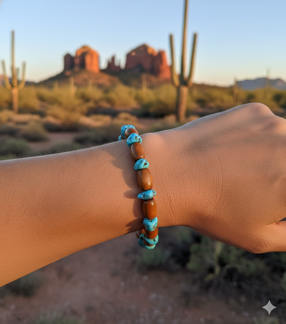 This simple yet bold stretch bracelet beautifully pairs the deep warmth of wood with a vibrant flash of color, reminiscent of a desert landscape. It features alternating: