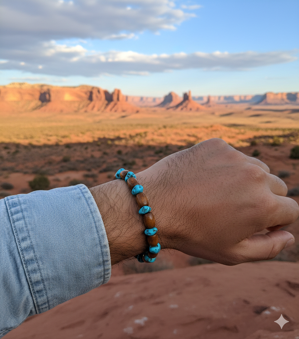 • Materials: Natural Wood, Synthetic Turquoise, Elastic Stretch Cord
