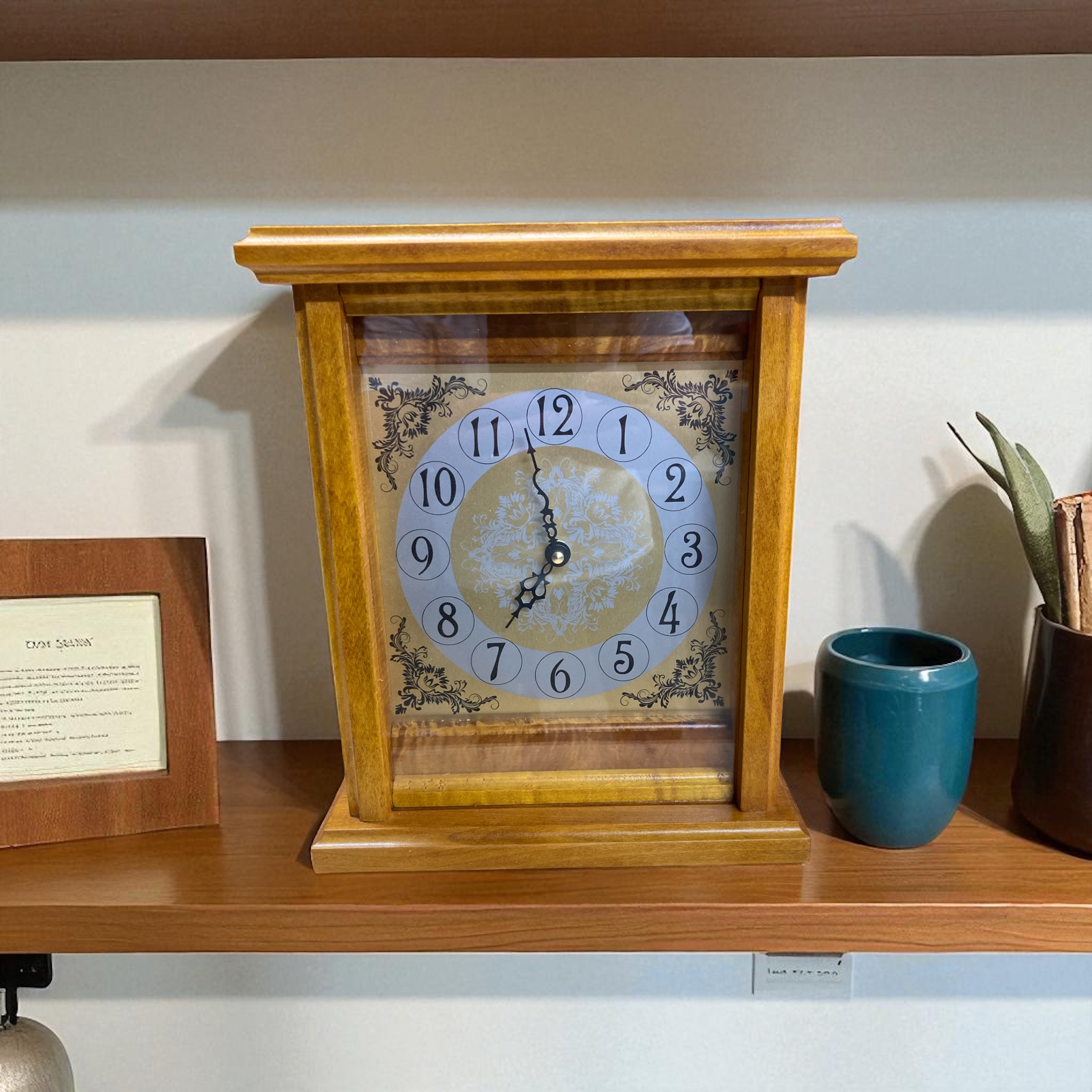 This beautiful clock is a one of a kind. you will love showing this clock off to those guest and relatives. The clock is 10" x 8" x 5". The clock looks like an antique , but it's brand new. I wanted to give it a traditional appeal with a slight modern feel. There is a battery movement that takes a AA battery, replaced in the rear of the clock without remove any covers for conveniences. There is a acrylic front that can be removed from the bottom by removing two screws and bumpers.
