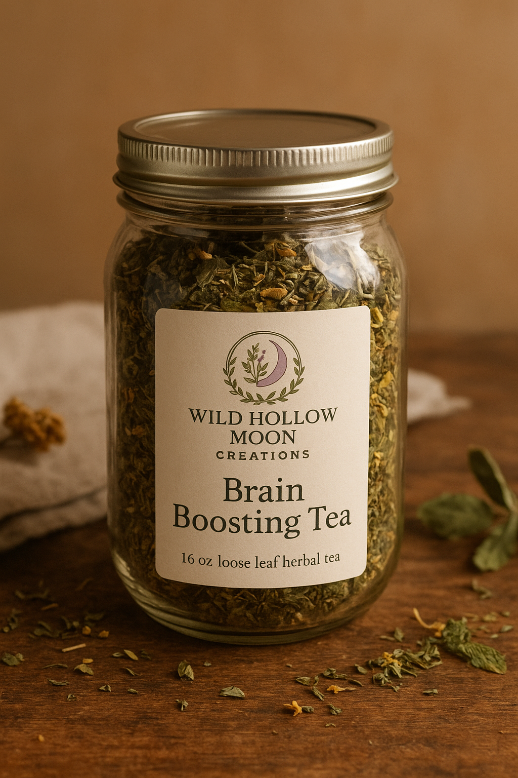 Brain Boosting Tea is handcrafted in small batches using carefully selected herbs known for their clarity-supporting and uplifting qualities.