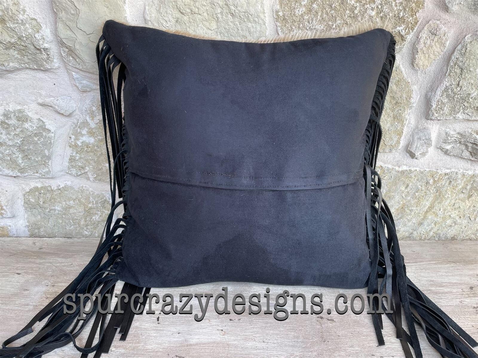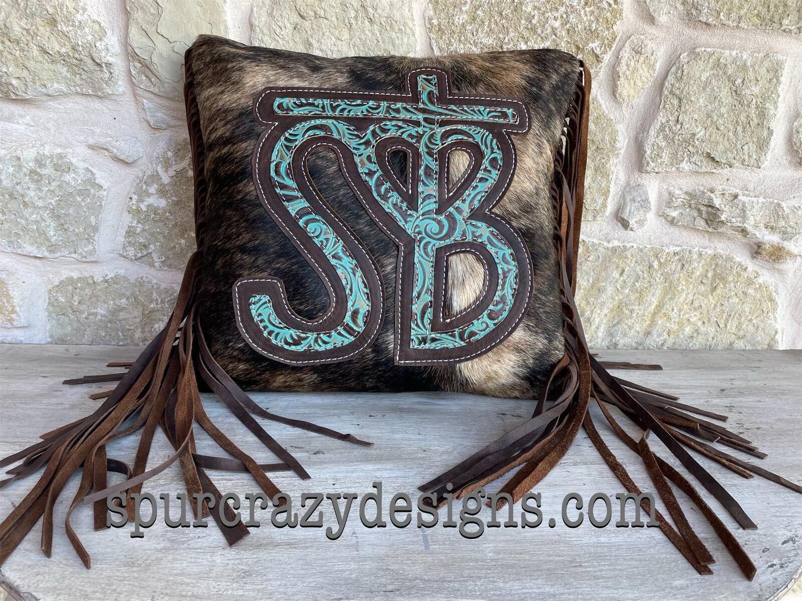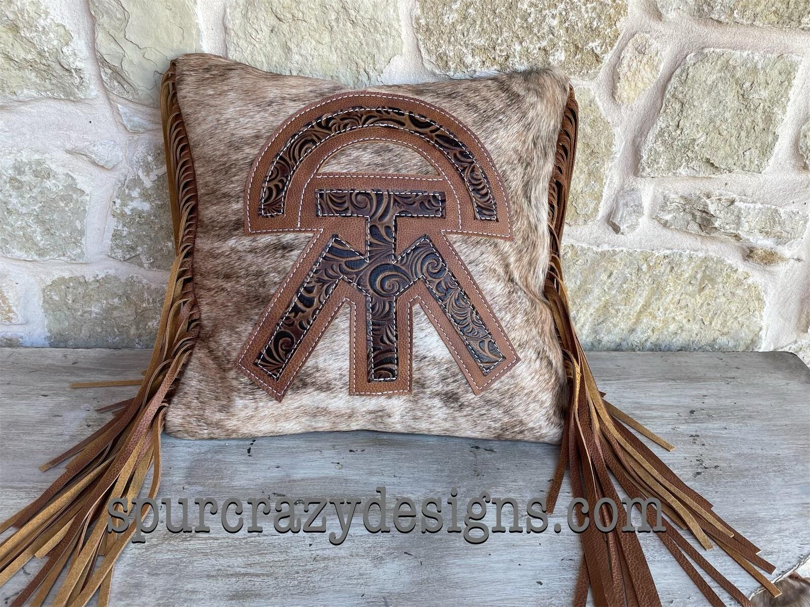 MADE TO ORDER: Brindle cowhide brand 18"x18" pillow, perfect accent to any style and any room. Brands are embossed leather and the pillow base is real cowhide. Choose the color option you want and send a picture of your ranch or farm brand through messages. The back of the pillow cover is made with a matching microsuede material and has a hook and loop closure so that the pillow insert can be removed for cleaning. The pillow can be made with or without 12" dark brown fringe if desired. If your brand is very detailed and has a lot of parts to it, there may be additional costs to create it. If you are unsure if your brand will work, please message me. The pillows include a 20"x20" pillow insert. Please allow 3-4 weeks until shipped.