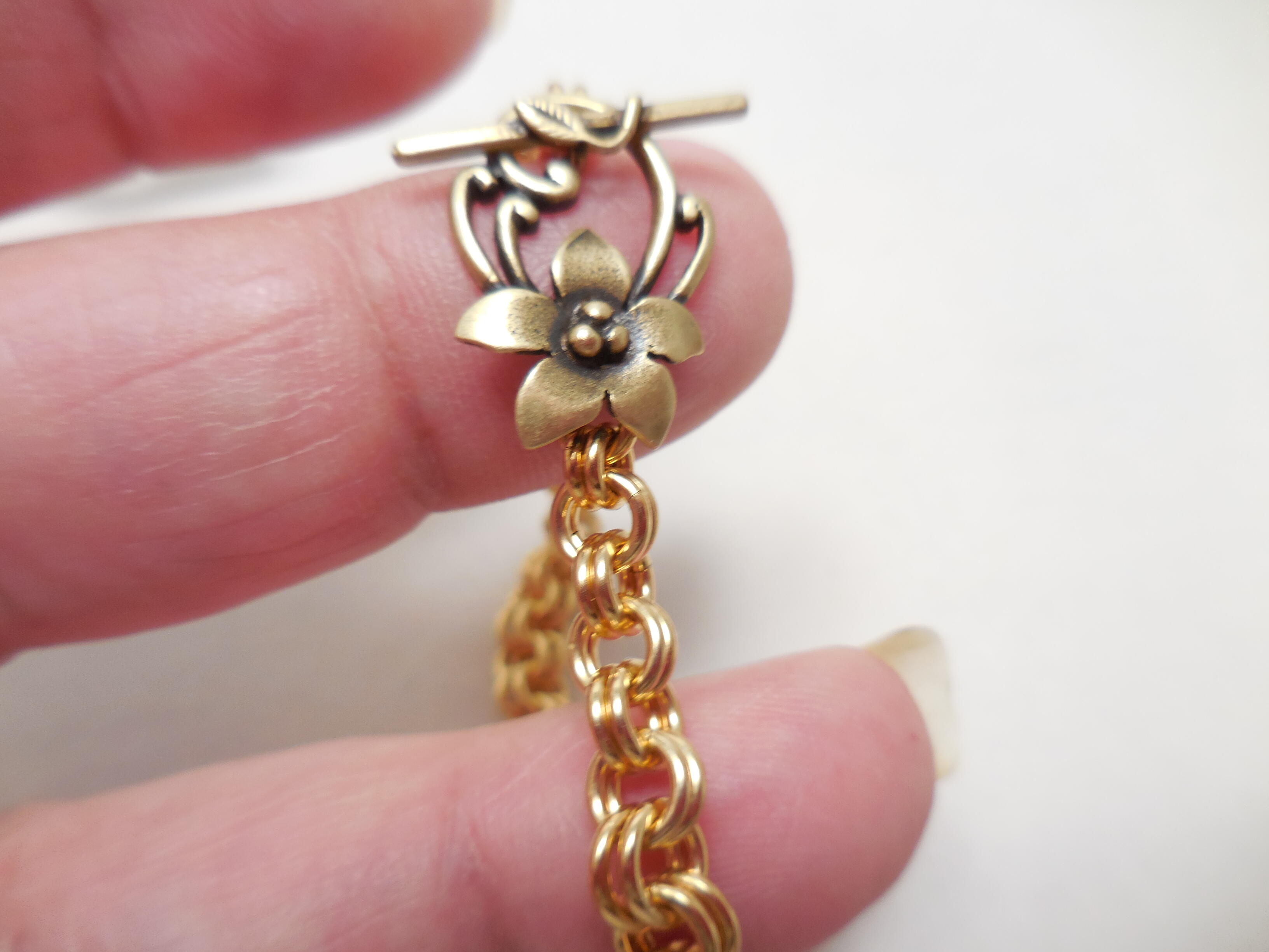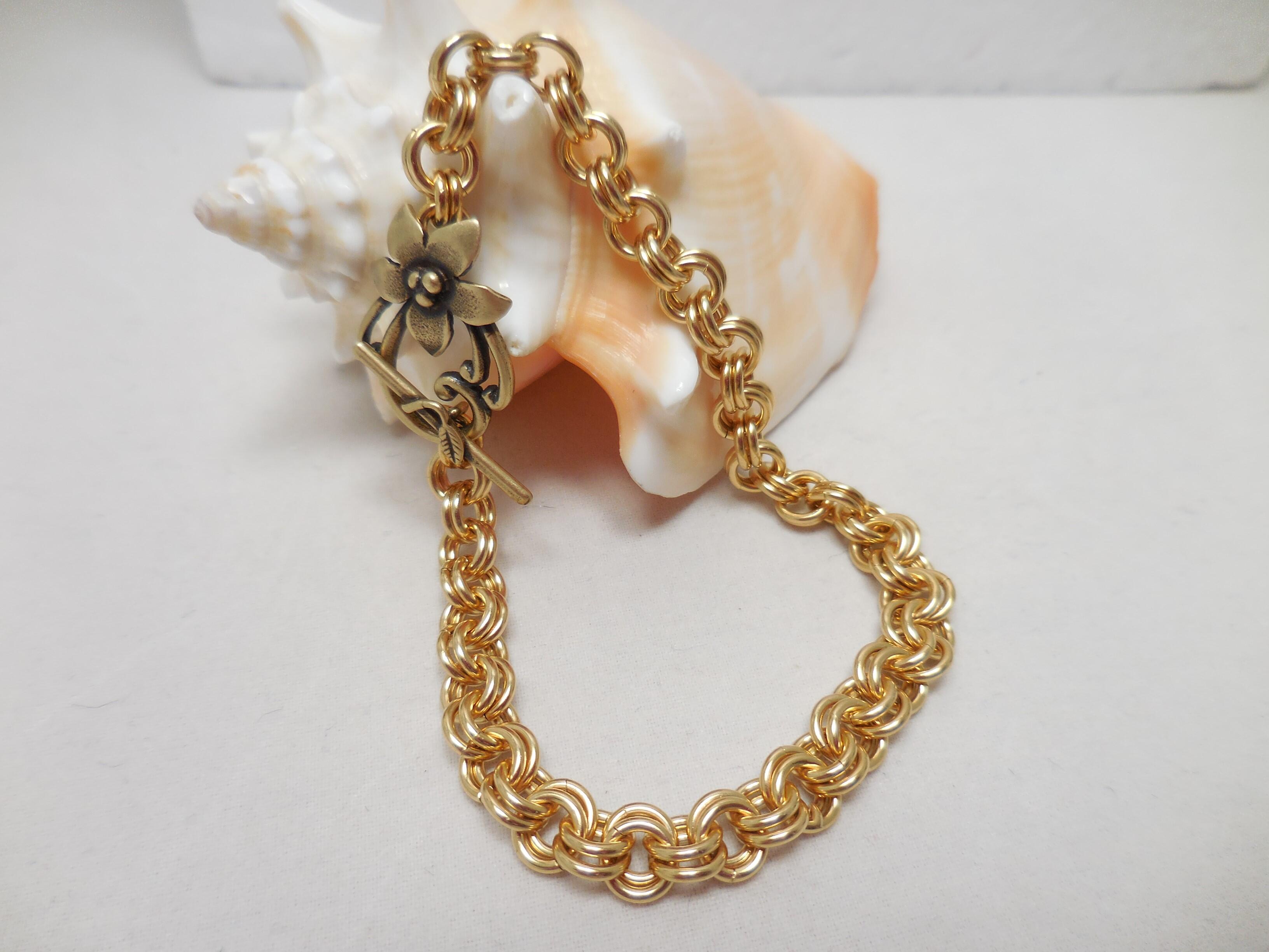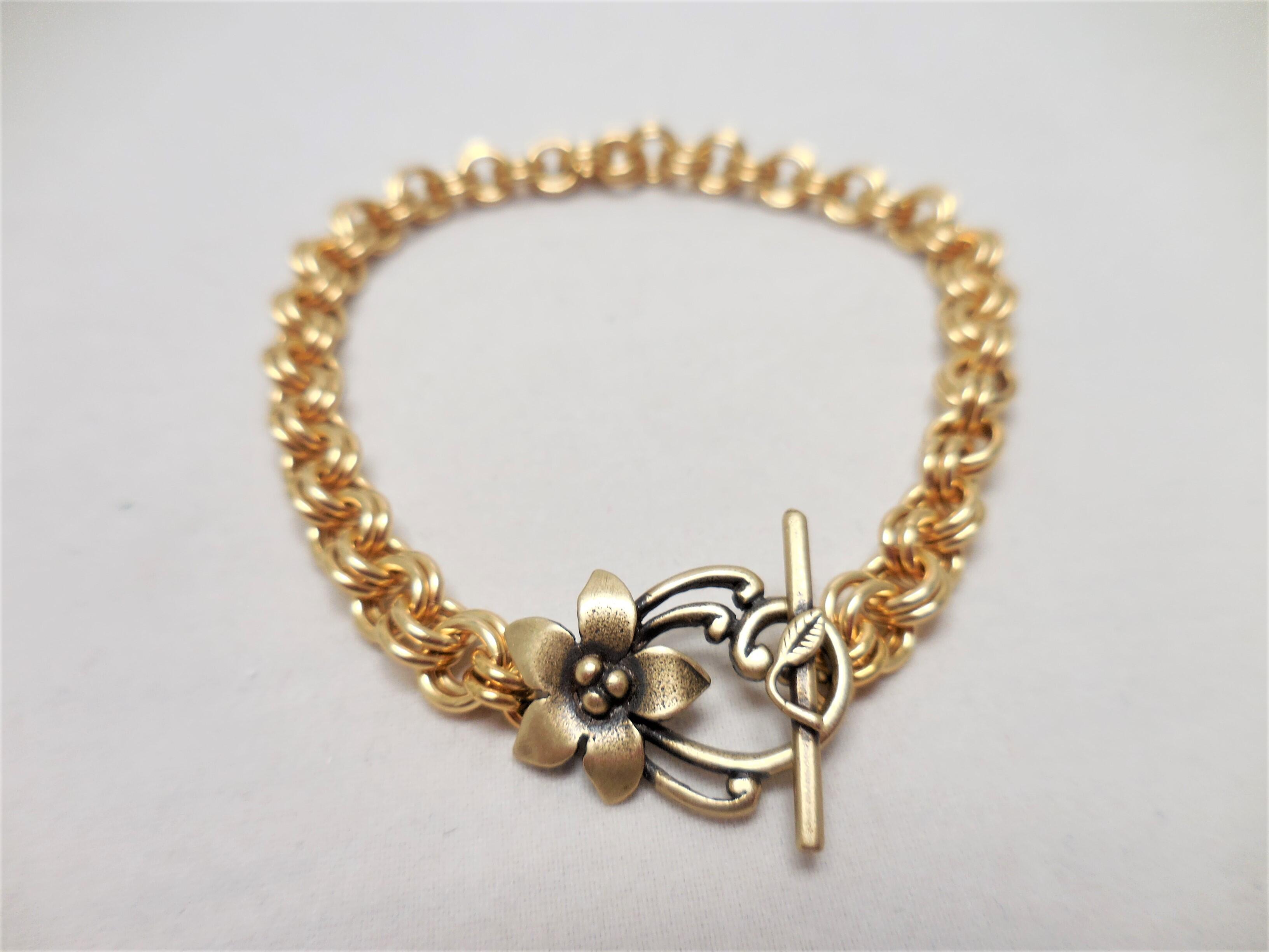 This dainty, feminine chainmaille bracelet is made of small natural brass jump rings in a 2 in 2 weave carefully woven together for a smooth silky feel and look. It's finished with a natural brass flower toggle which is antiqued to bring out the beautiful details in the flower.