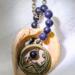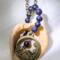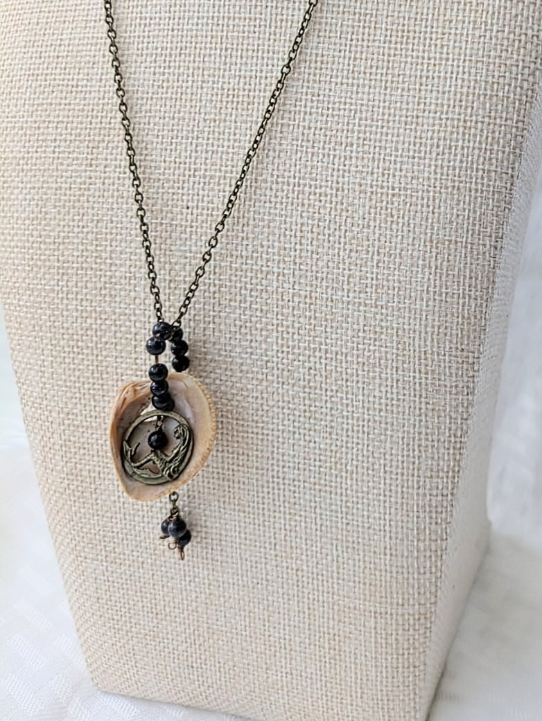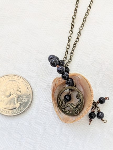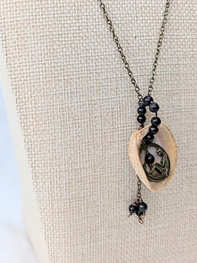 This sweet Brass Mermaid nestles herself inside this seashell. There are 12 Blue Goldstone beads (4-5mm). And one 6 mm Blue Goldstone bead. The brass chain is approximately 17" long with a 1" extender and is finished off with three 4 mm Blue Gold stone beads. The blue color of the beads contrast nicely with the tan, brown and orange colors of the shell and Mermaid charm.