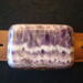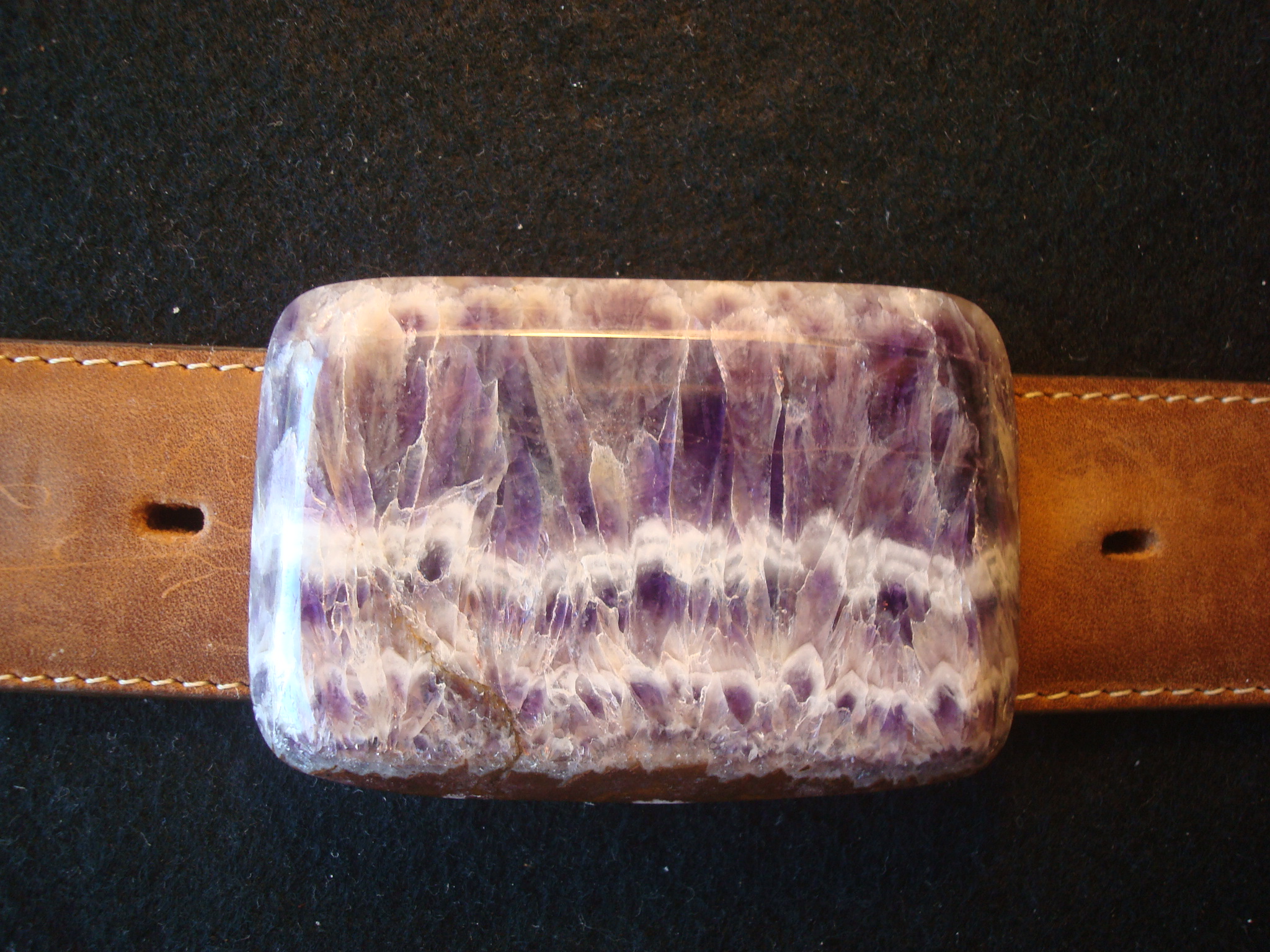 I have fashioned this piece from Amethyst mined in Brazil, a location where the most desirable amethyst is to be found. This buckle is formed in the bevel edge design and the stone is supported with my handmade German Silver backing . The backing is signed and dated along with the stones name. This buckle will accept a belt up to 1 1/2", it measures 2" by 3" and is approx. 1/4'" in thickness. Note that German Silver is not silver but an alloy comprised of nickle ,brass and zinc.The reasons that I choose to use it is because it's stronger, less expensive and it doesn't tarnish as does silver.