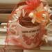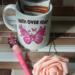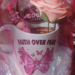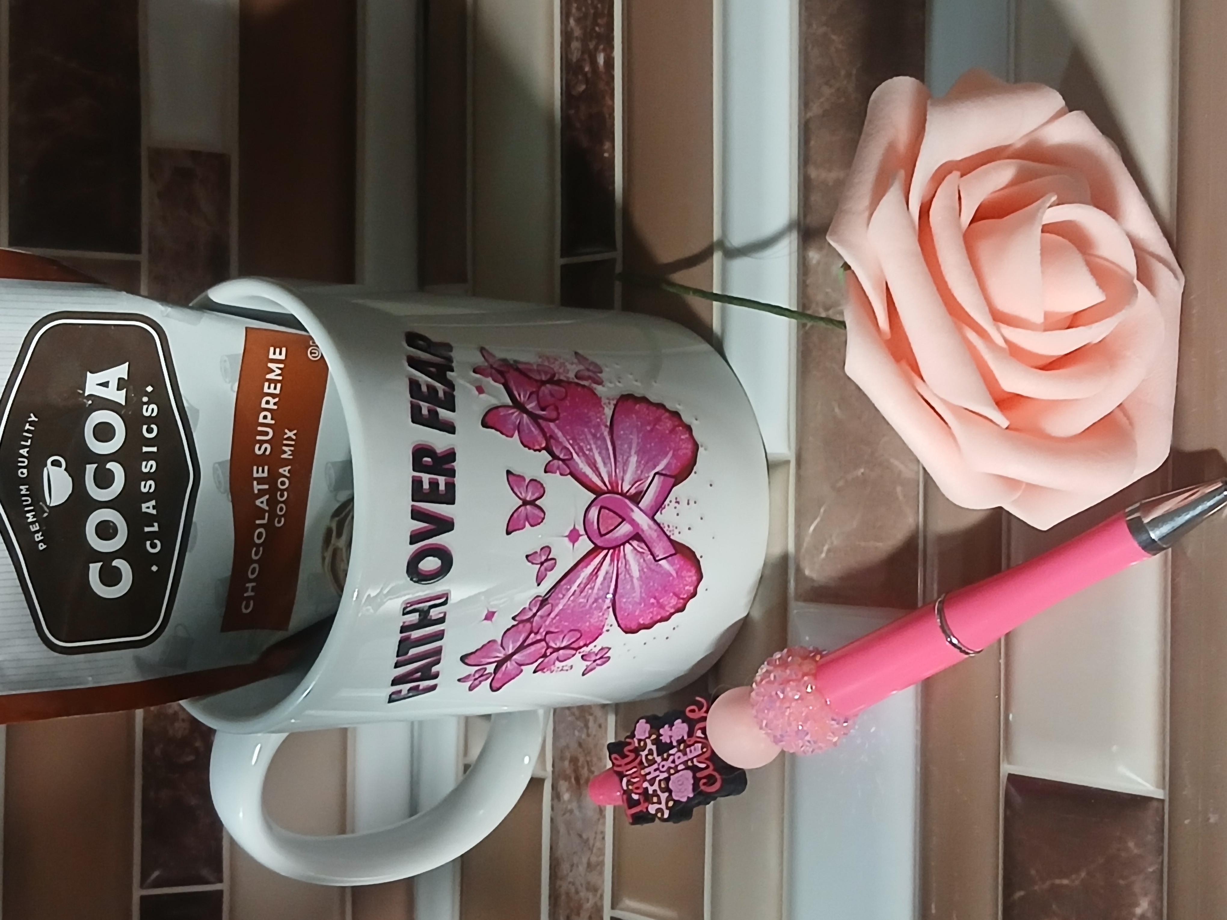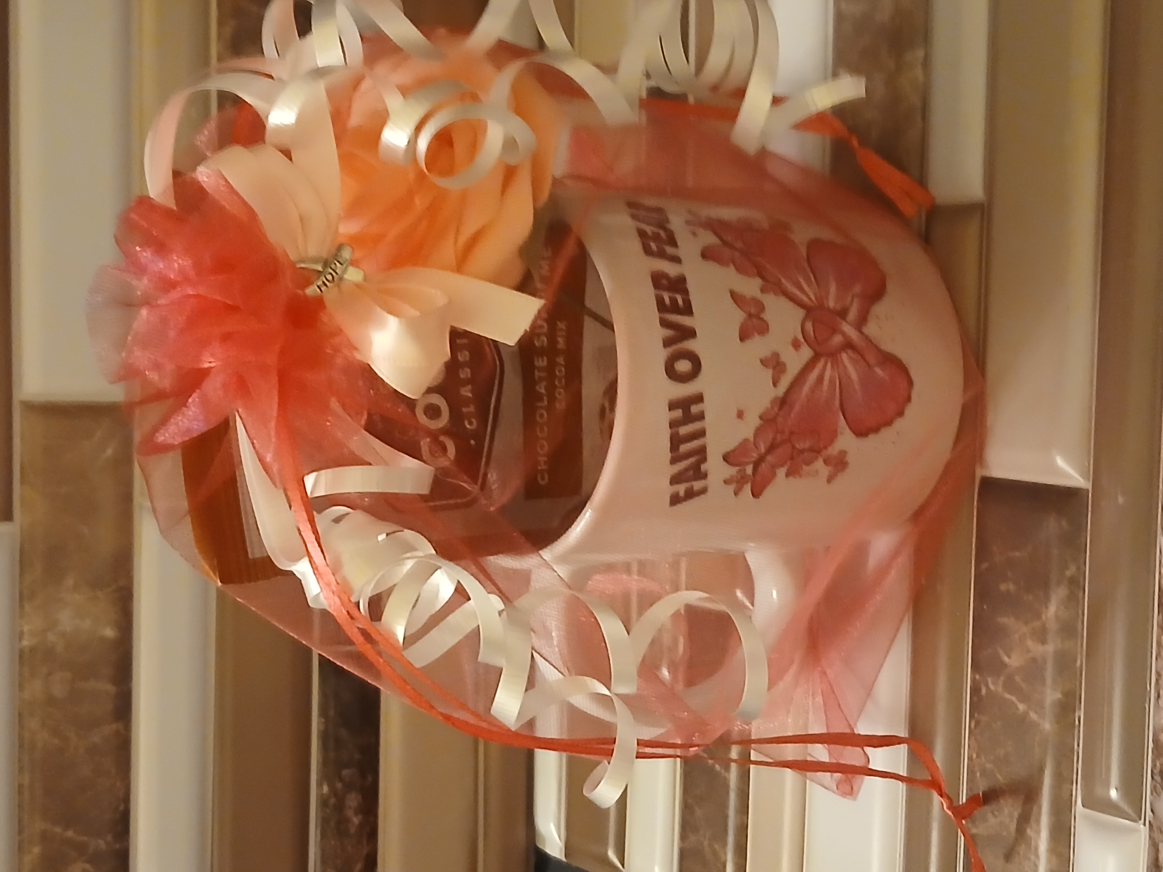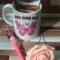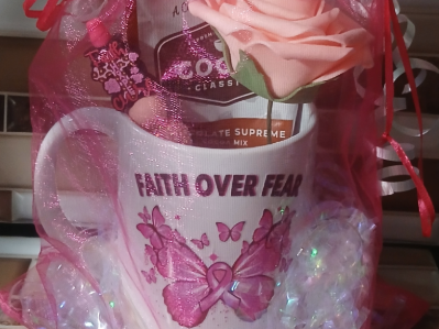 A gift for breast cancer awareness a coffee mug with 20 different designs and has hot chocolate a breast cancer pen and a pink fake rose in a pink organza bag with white ribbon and pink bow with silver cancer ribbon charm says hope