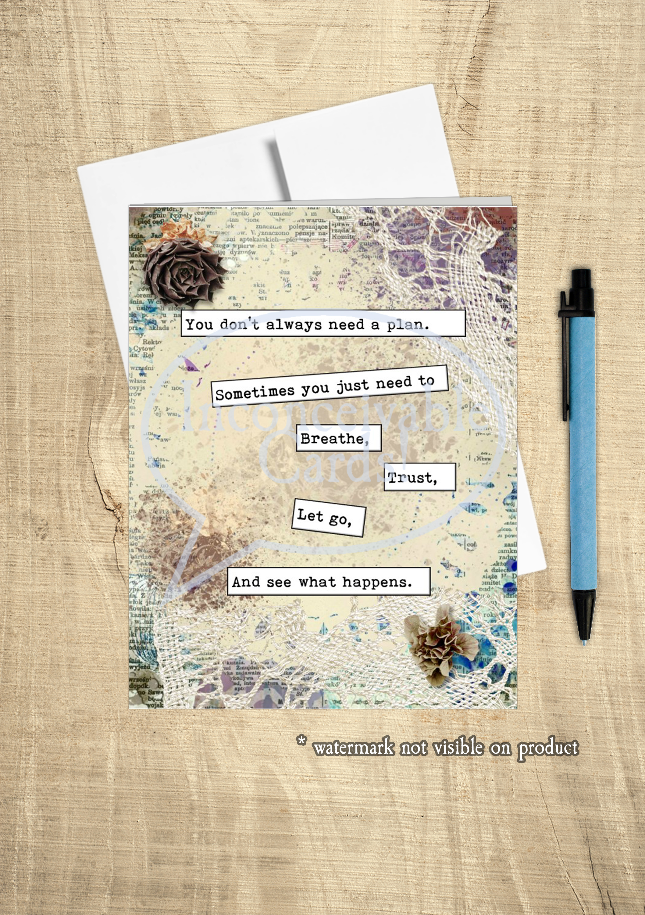 You don’t always need a plan. Sometimes, all you need is a semi-chaotic collage background, a deep breath, and an emotionally supportive greeting card to remind you that winging it might just be the plan.
