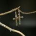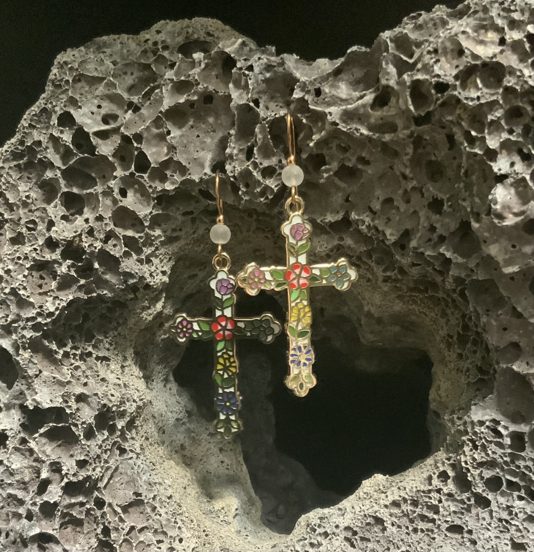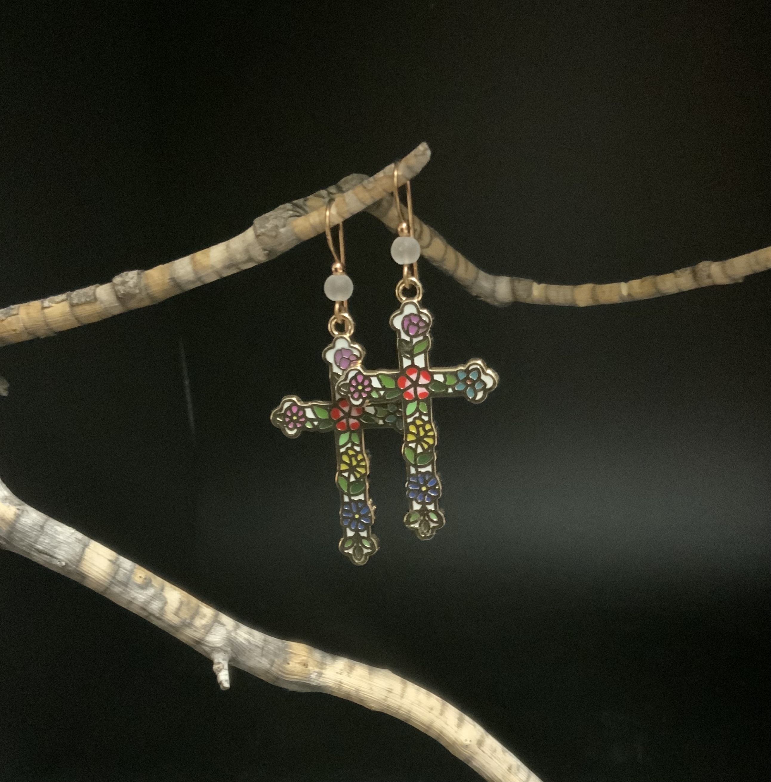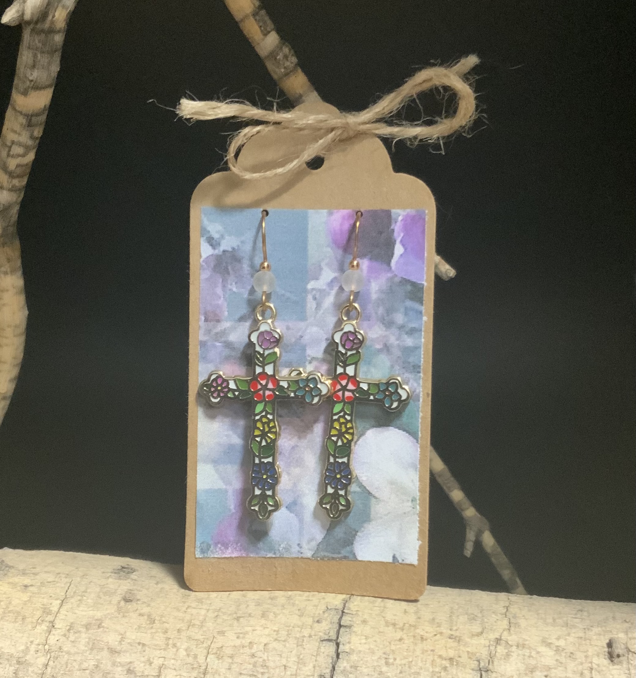 These cross earrings have handmade ear wires with bronze wire and 4mm white beach -style glass beads. The colorful flower pattern on the cross makes it look like stained glass. Very pretty. Each pair of earrings comes displayed on a handmade card.