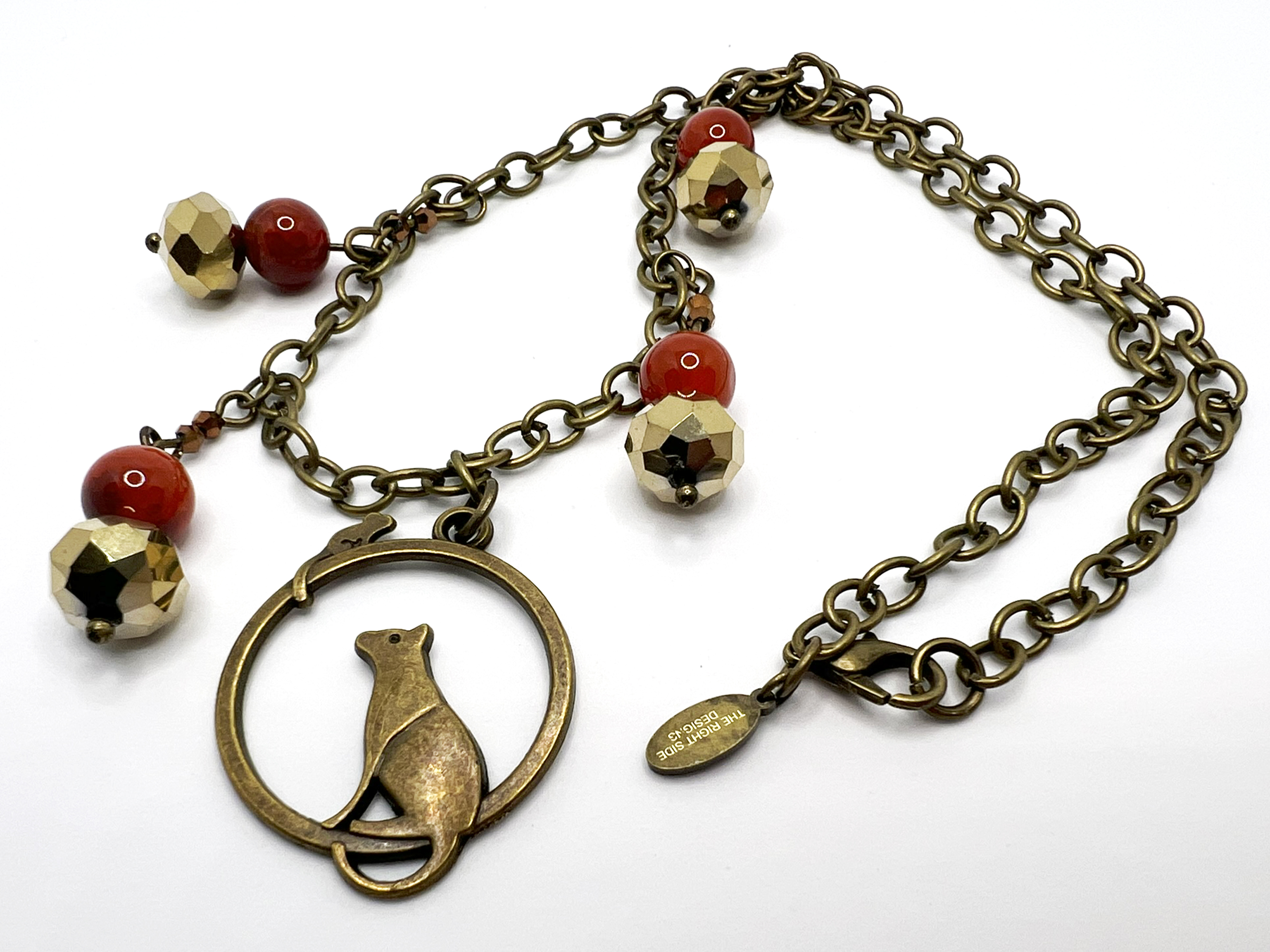 A touch of spooky elegance with a playful twist! This necklace features a bronze cat and mouse charm framed by dangling accents of 8mm burnt orange agate beads and 10mm gold faceted rondelle glass beads.