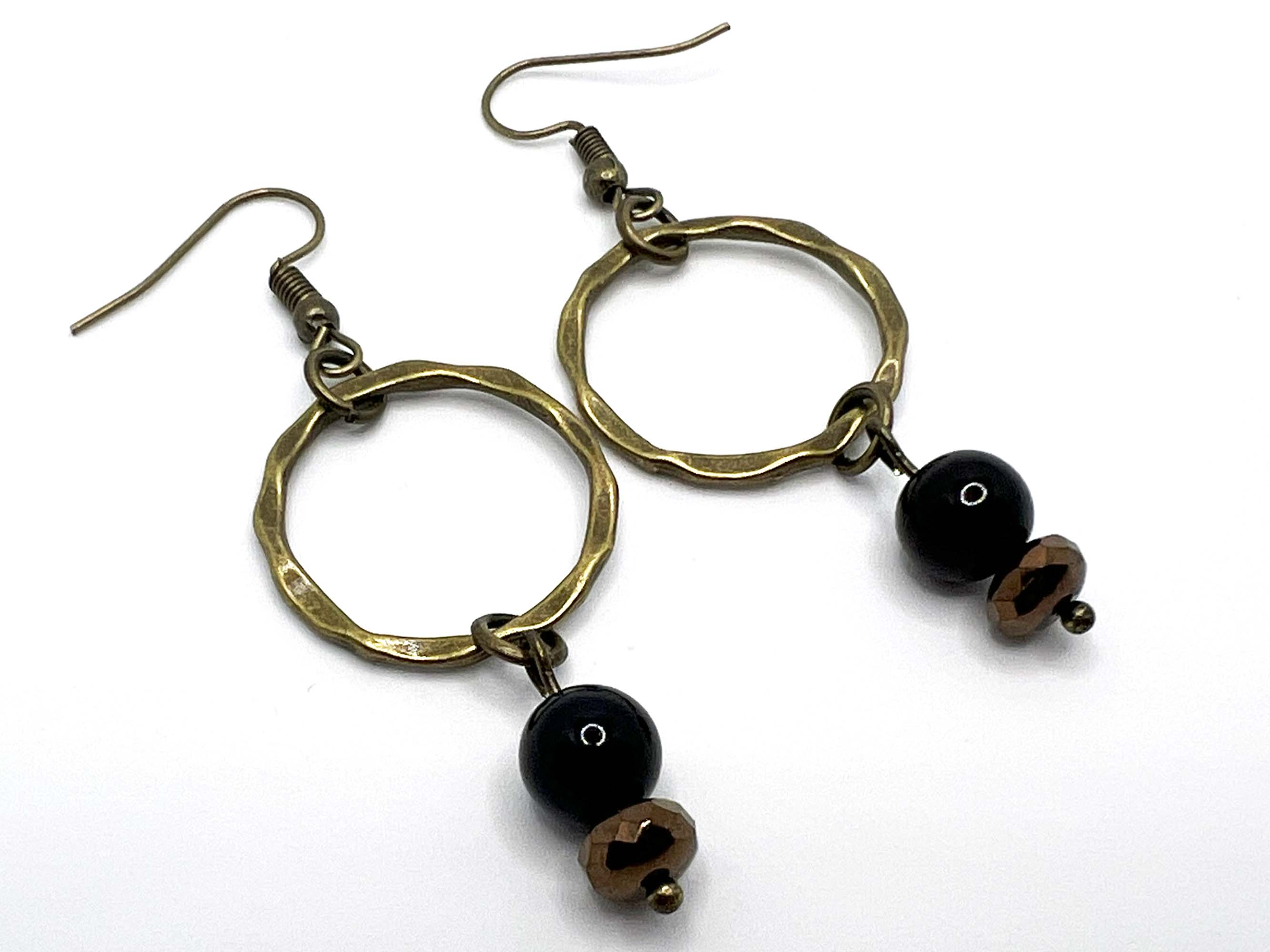 These artisan-style earrings feature 6mm acrylic black beads paired with bronze-toned crystal cut accents, suspended from textured 22mm bronze rings for a rustic yet elegant look. Designed with bronze hypoallergenic ear wires, they are lightweight and comfortable for all-day wear. Each earring hangs approximately 2-1/4 inches from the earlobe, making them a perfect statement accessory.