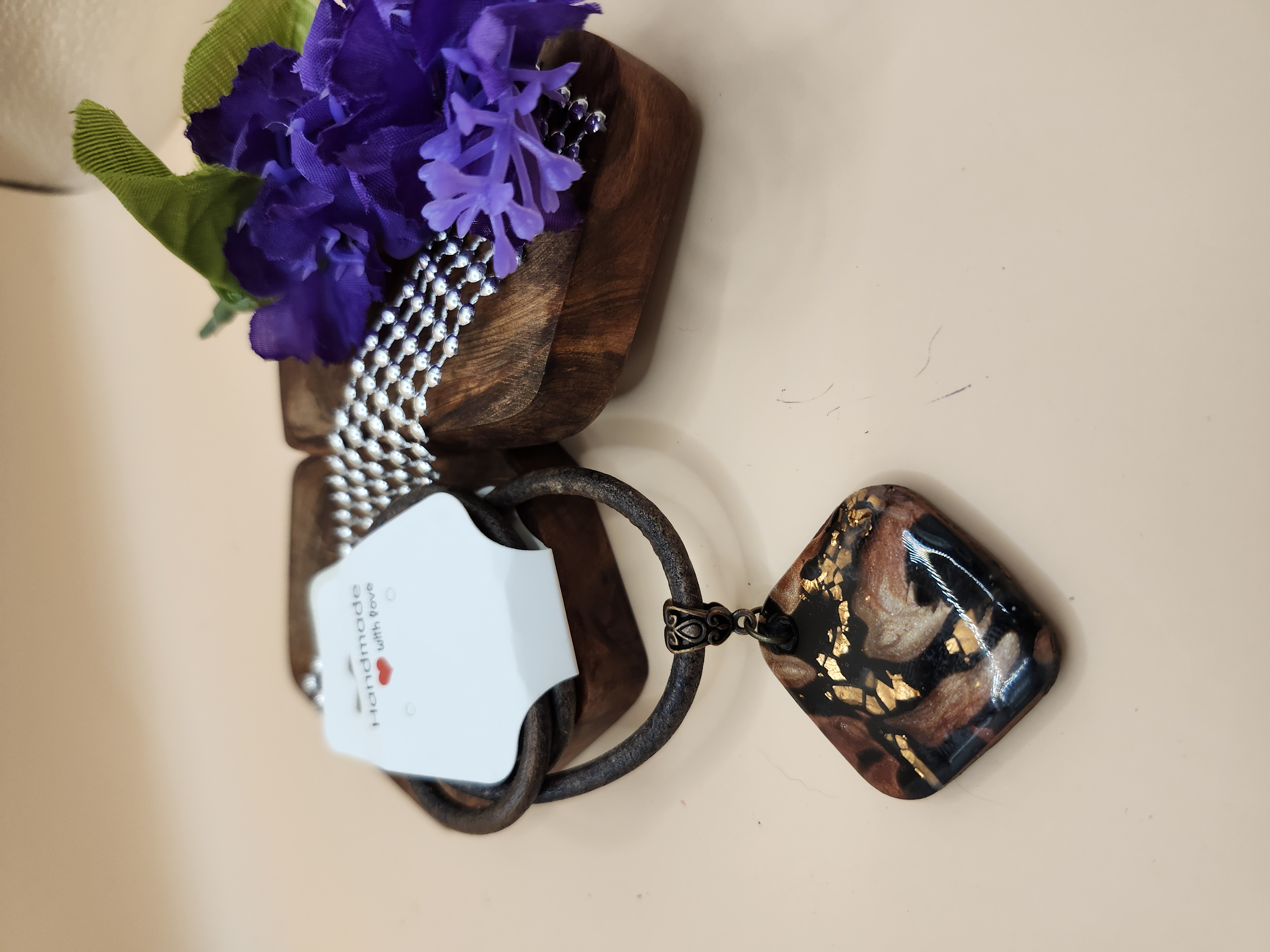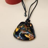 Stunning pendant in gold, black and bronze worn with a leather cord