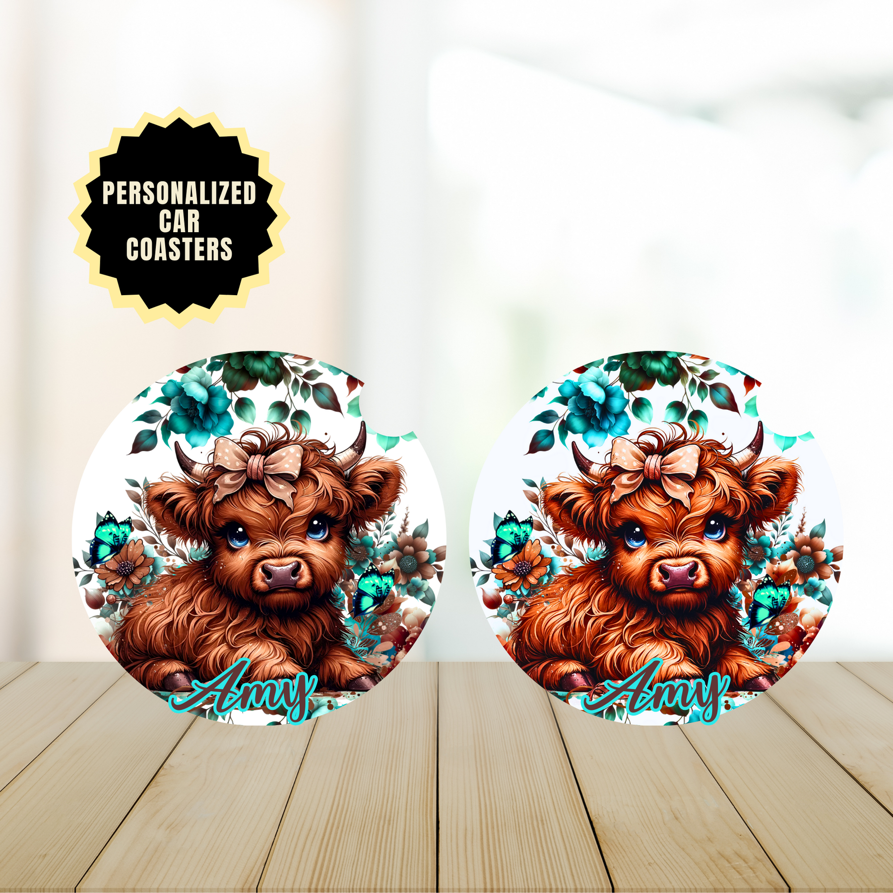 Love Highland cows, western style, and floral prints? This adorable brown cow car coaster set is a perfect addition to your vehicle! The moisture-absorbing ceramic material keeps cup holders clean, while the cork backing prevents slipping.The added cork backing also protects tabletop surfaces, should you also want to use your car coasters at home or at work.
