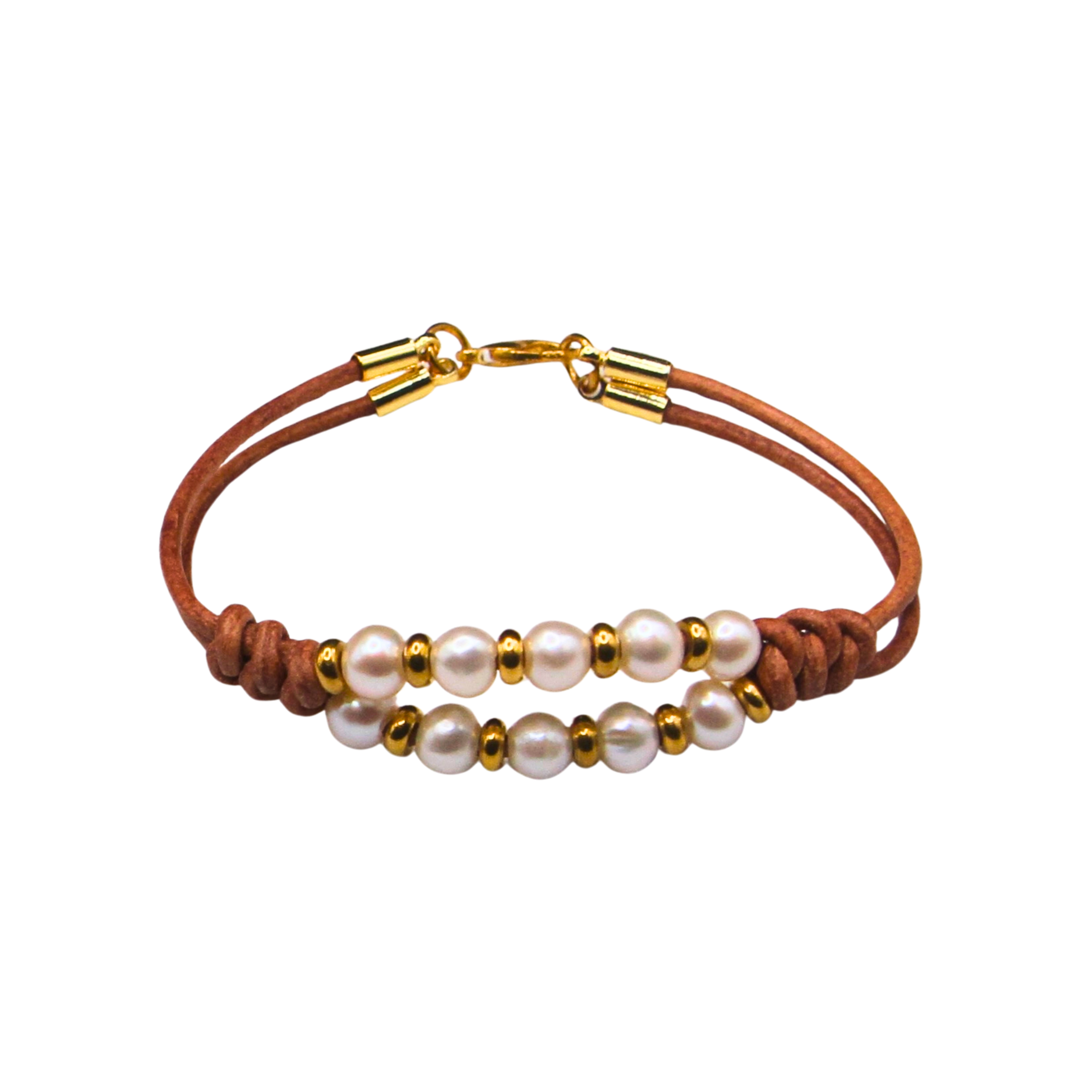 The hand tied knot in the leather not only adds to the refined and stylish look of the bracelet, it is functional too! The knot keeps the pearls centered so they will not ride up and down the leather cord as you move. This constant pearl movement can be annoying and also leave unsightly wear marks on the leather cord.
