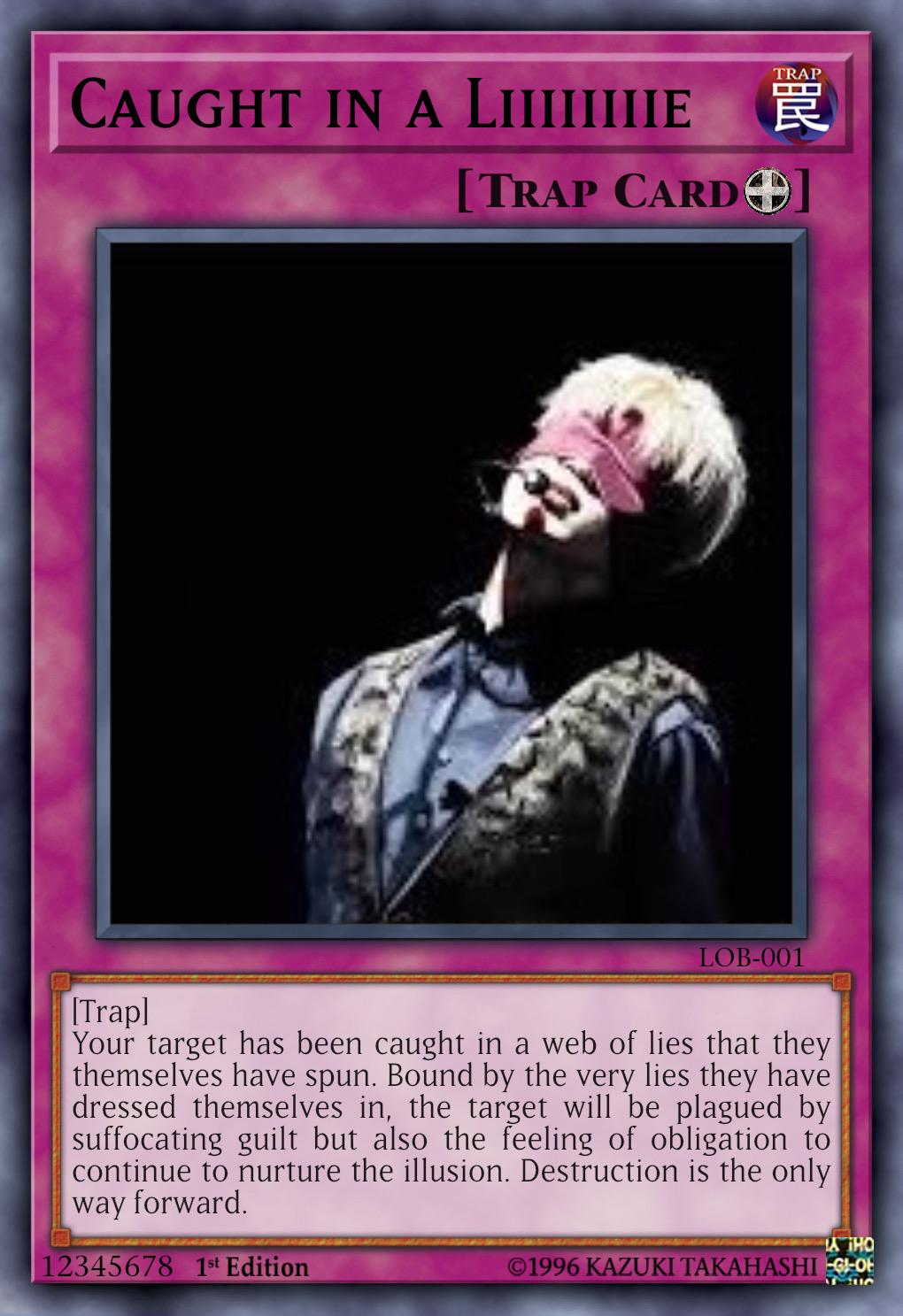 Nobody can lie their way out of a reckoning forever. Jimin would never! Using this card as a foci (or just as something to ruefully cackle at), The Artist makes those lies of the lying liars who tell them energetically sticky, ultimately trapping the Target in the bindings of their own falsehoods, weighed down by crippling guilt, rendering them utterly rekt and pathetically powerless.