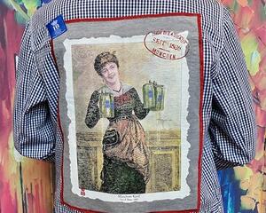 I specifically use re-claimed denim and found textiles for eco-sustainability. Treasure hunting jackets and design elements in unusual places gives me unending inspiration. I love coming across something that speaks to me, saving it from a long slow death in an obscure landfill somewhere, and creating a one-of-a-kind piece of art. Jackt’s have 2-6 different textiles that are combined with denim into one new original work.