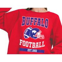 Be wild and show your team spirit with our Buffalo tie-dye sweatshirt. Off the shoulder style and glitter accents add a playful touch. Let's go Bills!