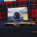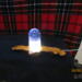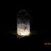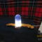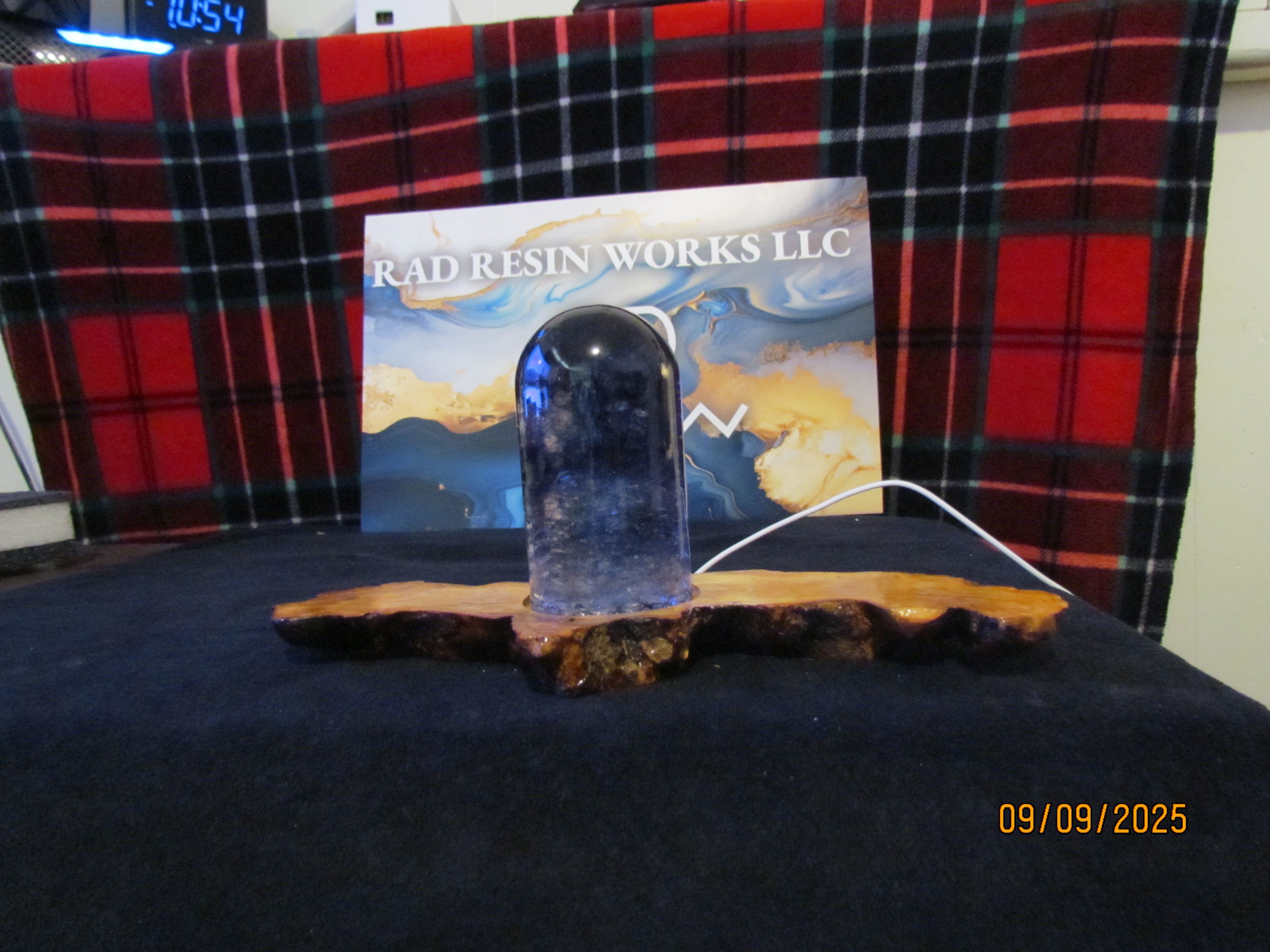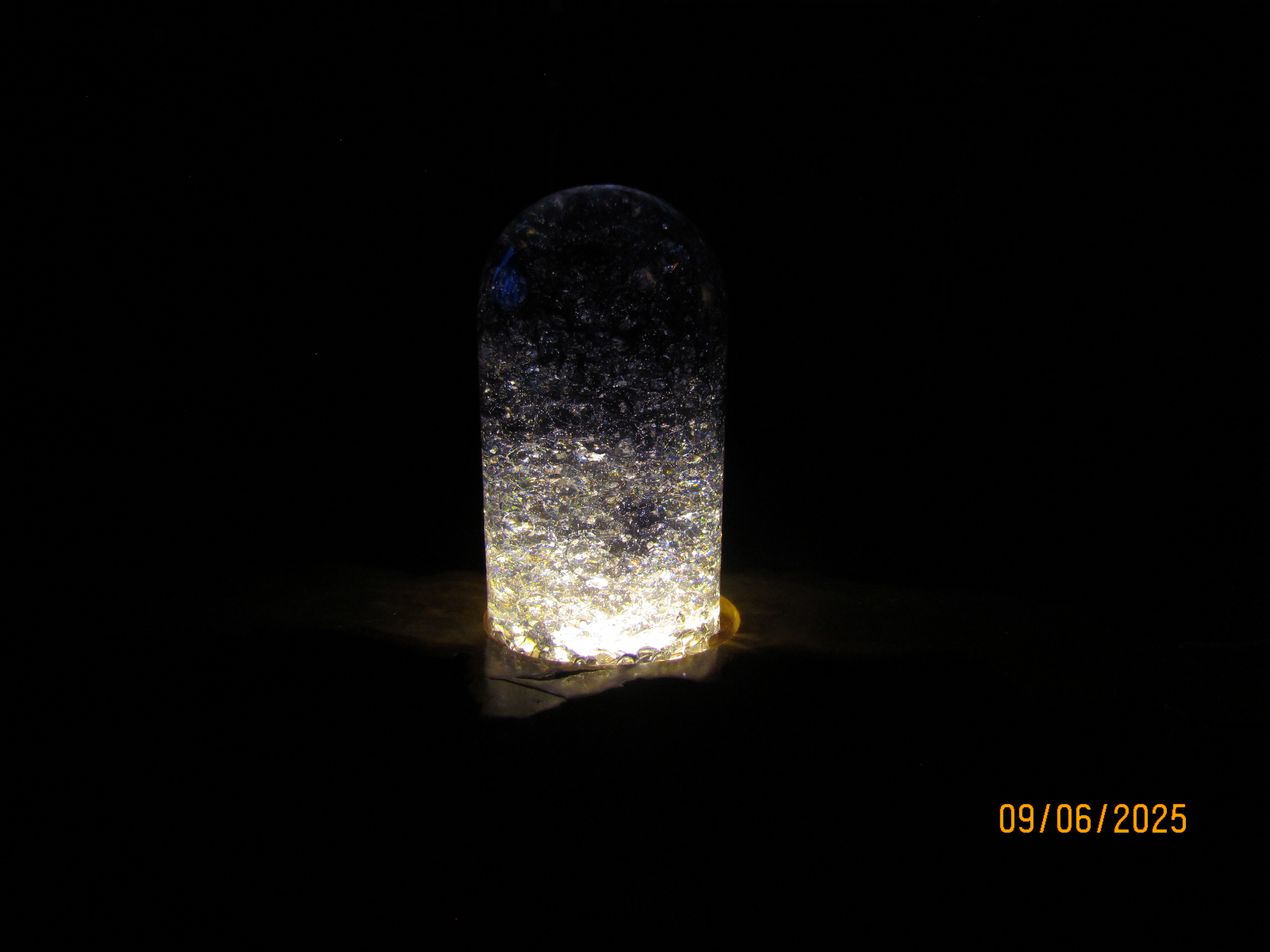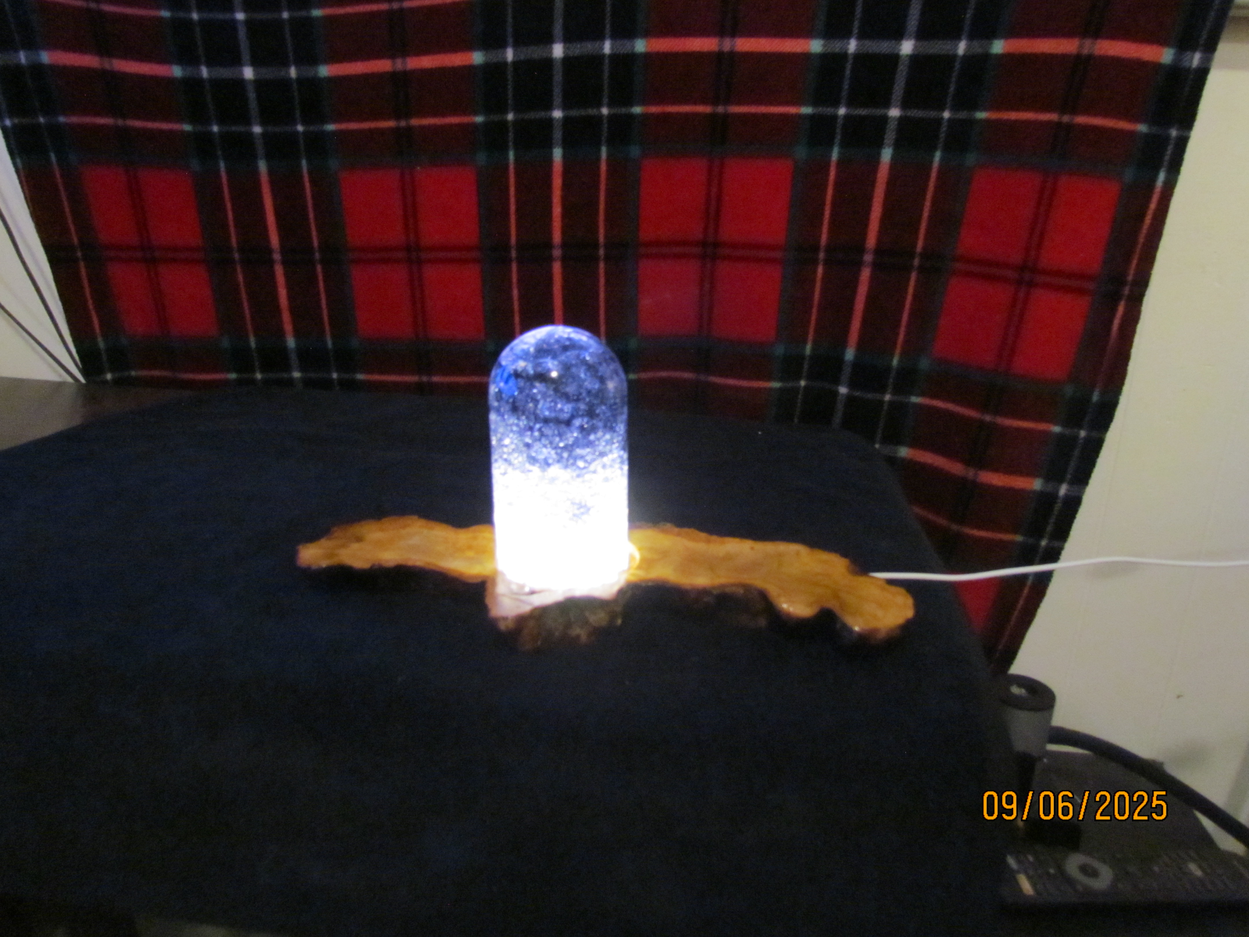 this piece has acrylic diamond crystals inside with black coloring mixed inside the bullet. it has a white USB light inside the olive wood base.