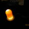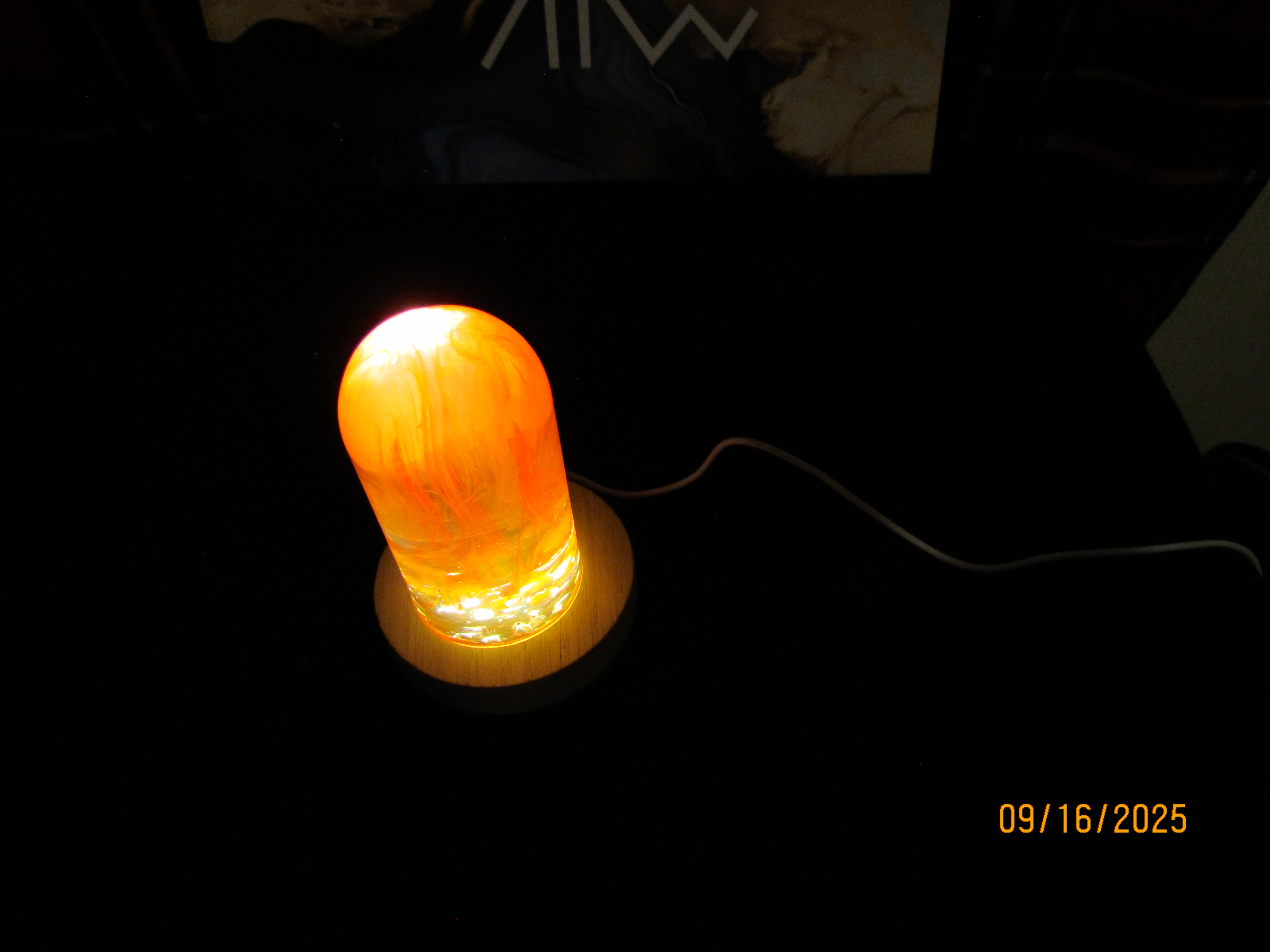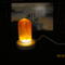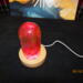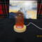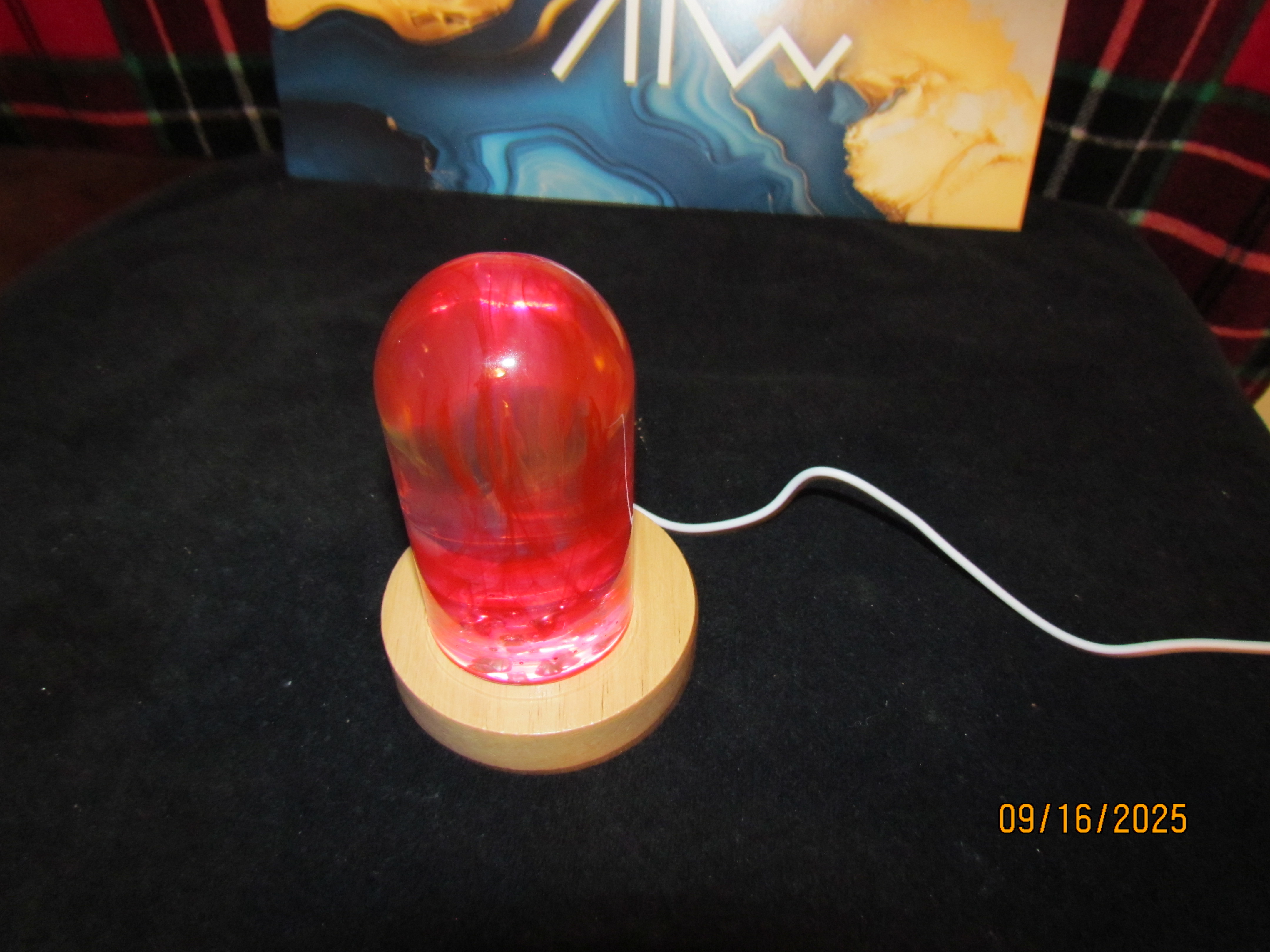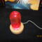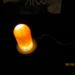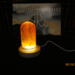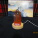 this nightlight has a clear bullet shaped piece that has red color swirls inside of it. it sits on a round wooden USB lighted base.