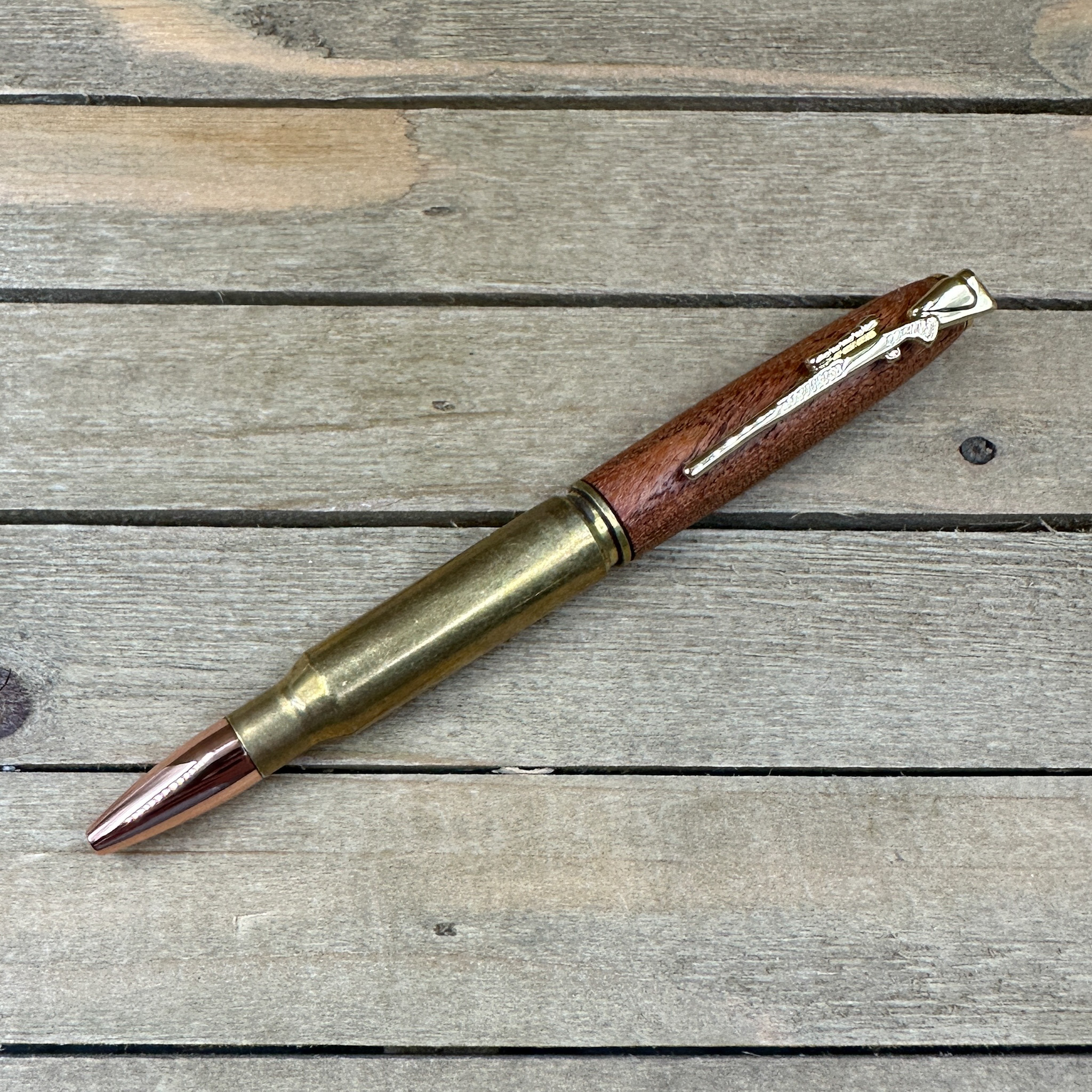This handcrafted .308 bullet pen combines rugged Western mesquite wood with an authentic brass rifle cartridge design, creating a unique writing instrument that’s both functional and collectible. Each pen is individually turned and finished by hand, highlighting the natural grain and character of Texas mesquite—no two pens are ever alike.