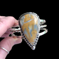 Bold, large Bumblebee Jasper Statement Necklace for her, a one of a kind gift for her. This unique necklace has been handmade using 925 Sterling Silver that has been oxidized, stamped and polished. The setting is a tall teardrop jasper cabochon that is in a Bezel setting accented with stamped cutout wire and beads. Including the bail this pendant is 2 3/8"H x 1"W, the stone is 39mm x 15mm and it comes on a 18" strand of 3mm Navajo Pearls with a lobster clasp.