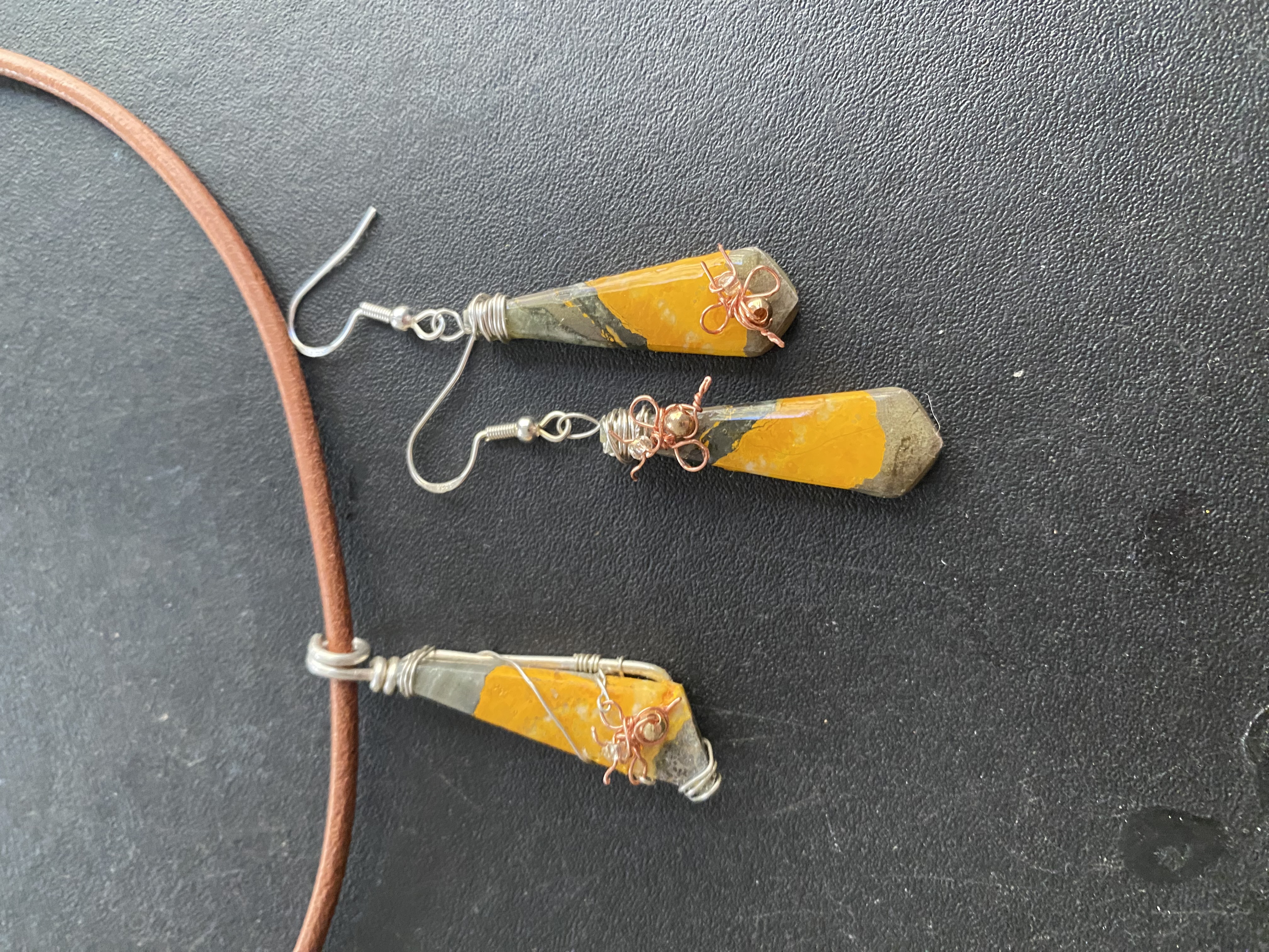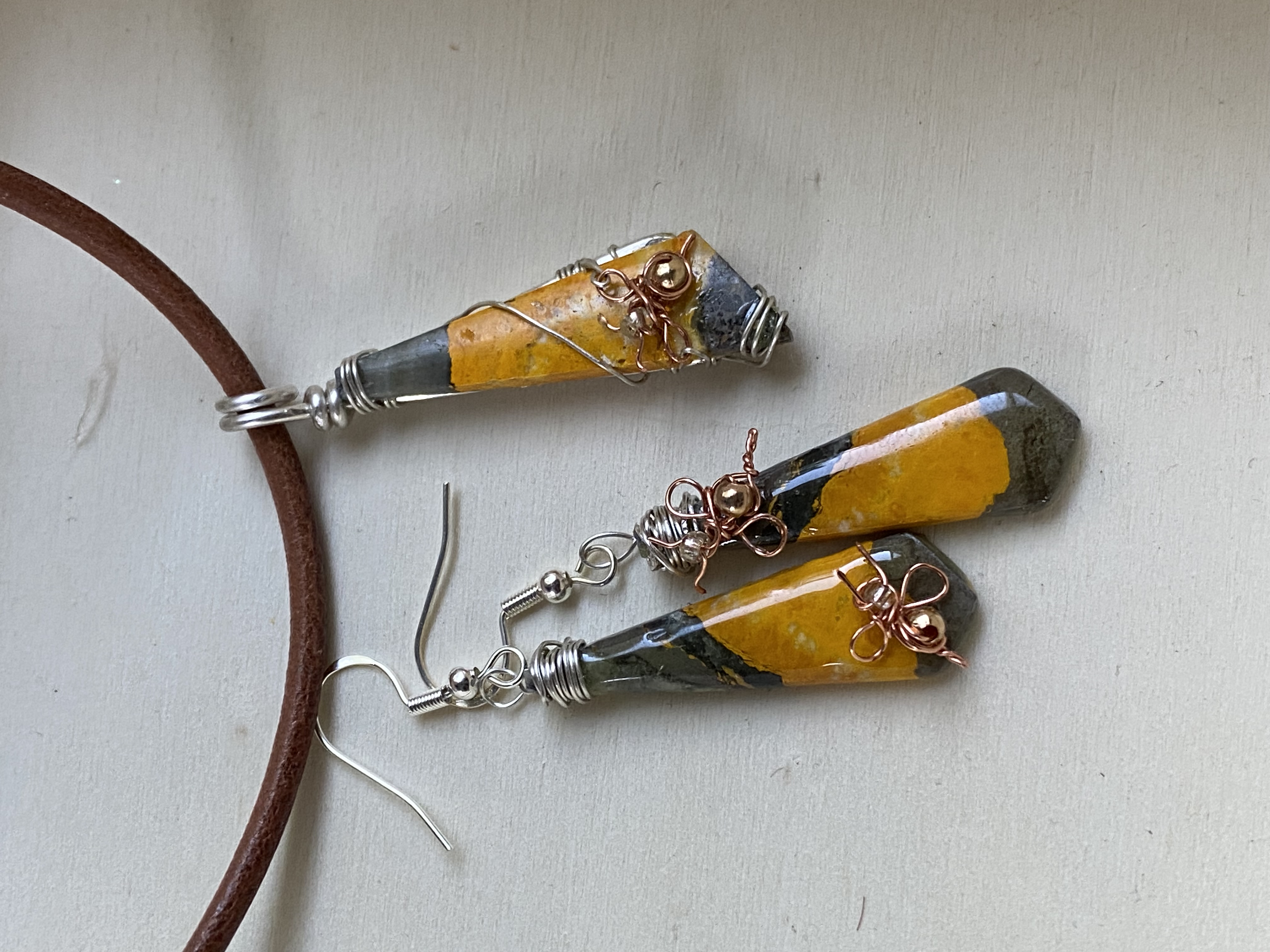 Bright, bold, and buzzing with life—BumbleBloom is a joyful celebration of nature’s smallest powerhouses. This handmade jewelry set features striking bumblebee jasper gemstones wrapped in warm copper and cool sterling silver wire, adorned with playful spiral bee motifs that give each piece its own whimsical personality.