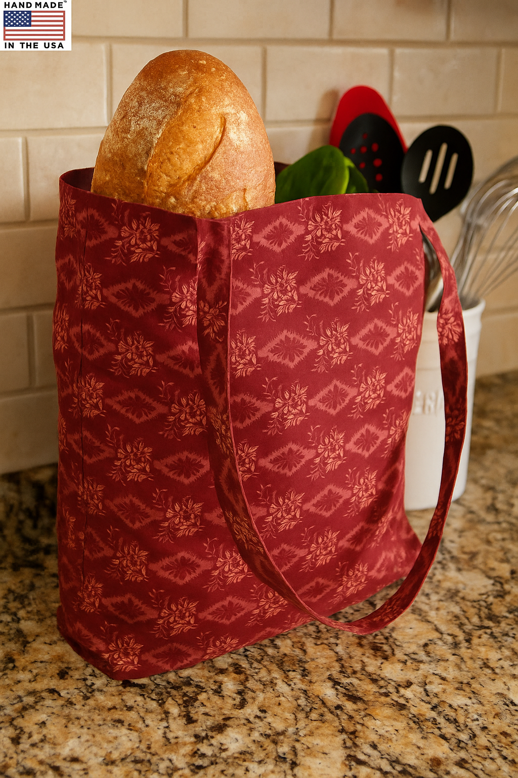 These handmade Tote Bags are Eco friendly! This large sustainable Burgundy Southwestern with burgundy inside grocery shopping bag will carry large and heavy loads for years to come. These are very functional. The reusable shopping bags are made from canvas and cotton. All inside side seams have double sticking for increased durability and strength. All my bags have a medium weight lining. The straps are made from 1" wide matching fabric, and they are approximately 18inches long and are comfortable to hold by hand, but long enough to comfortably wear on your shoulder.