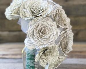 We cut each petal from a pattern specifically created for the style of flower we use in each piece. Each petal is then dipped in a color and hung on a line with clothespins to dry. We then attach each petal individually to its stem. Each flower will be styled and curled petal by petal to create a beautiful handmade paper rose. We use coffee filter paper to achieve a more realistic flower. The book page roses are created using a special solution that helps the petals curl and not rip yet keep their natural shade. We use hardback Harry Potter books.