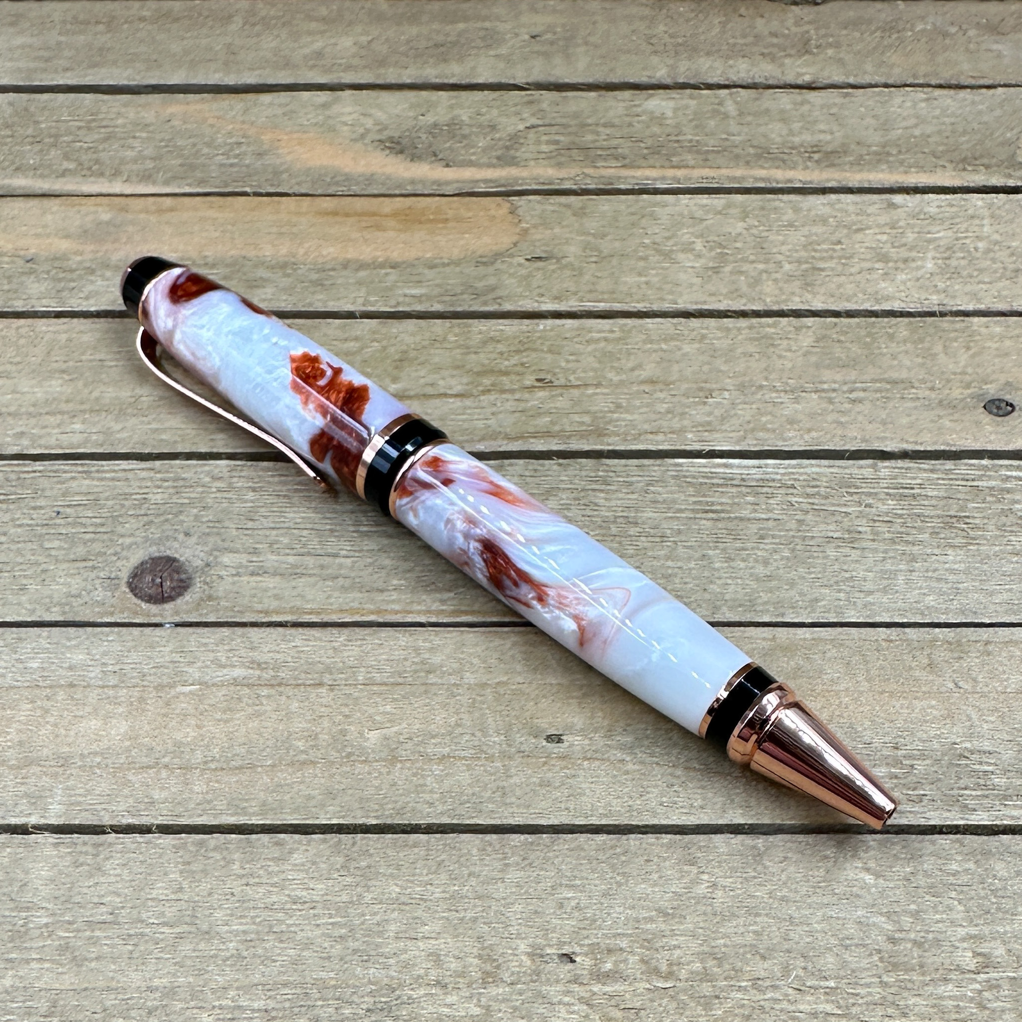This custom handmade pen, like all my other pens, was personally handcrafted by me in my woodshop. These are not mass produced pens and each one is handcrafted by myself so you are getting a craftsman's touch and love of their craft with each pen. Each pen I craft has subtle differences making it a truly one of a kind pen. First, I take a custom blank I made, in this case a copper and white swirled resin blank, and prep it for pen making by drilling and gluing in the inner tube hardware. Second, it is meticulously turned down with my lathe to fit the beautiful copper cigar pen components taking proper care that it transitions to the pen hardware perfectly. Finally, the pen is wet polished to a very high gloss which gives the pen a lot of depth and really brings out the color. All of my pens have already been produced by me so you know you will be getting the pen pictured in the listing. This eliminates the guess work on how it will look like once made and my pens are ready to ship without long waiting times.
