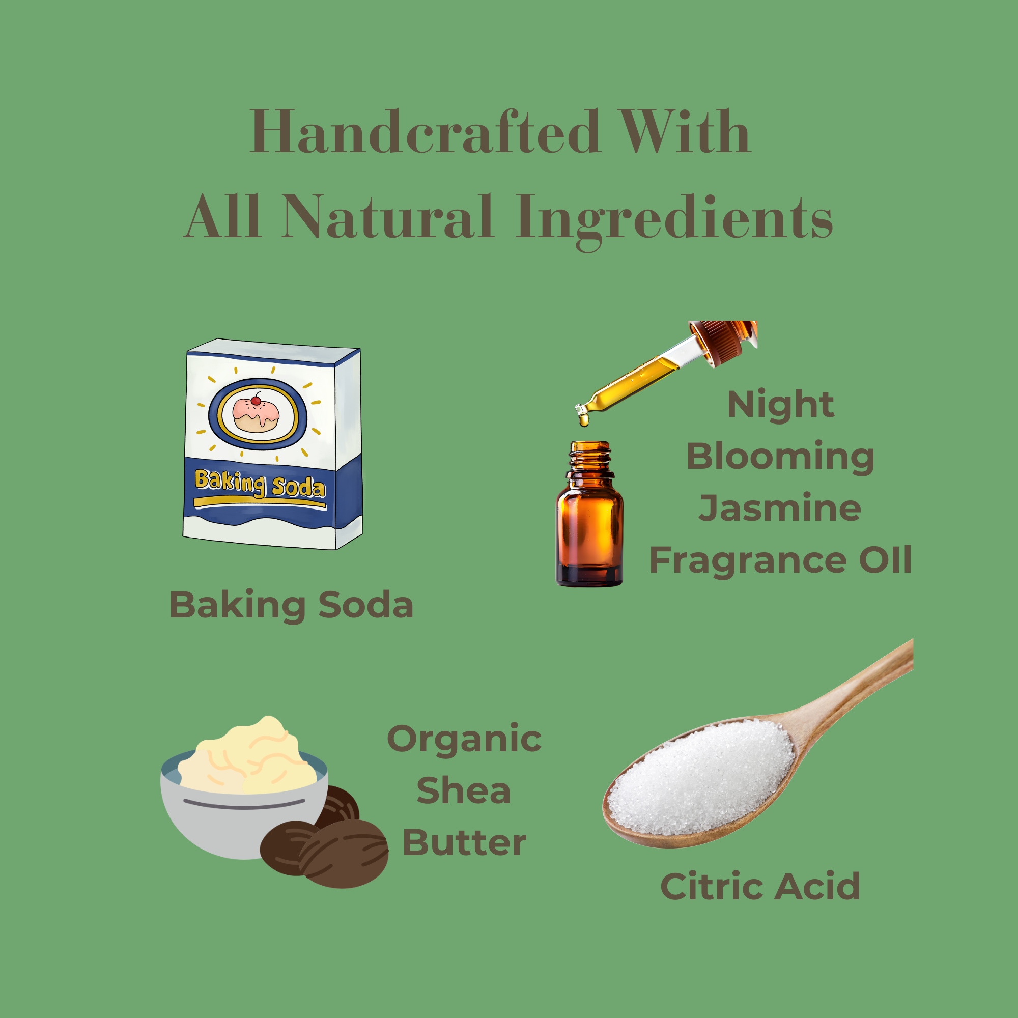 Ingredients: Baking Soda, Citric Acid, Organic Shea Butter, Polysorbate 80, Essential Oil, Cosmetic Grade Mica, Kaolin Clay