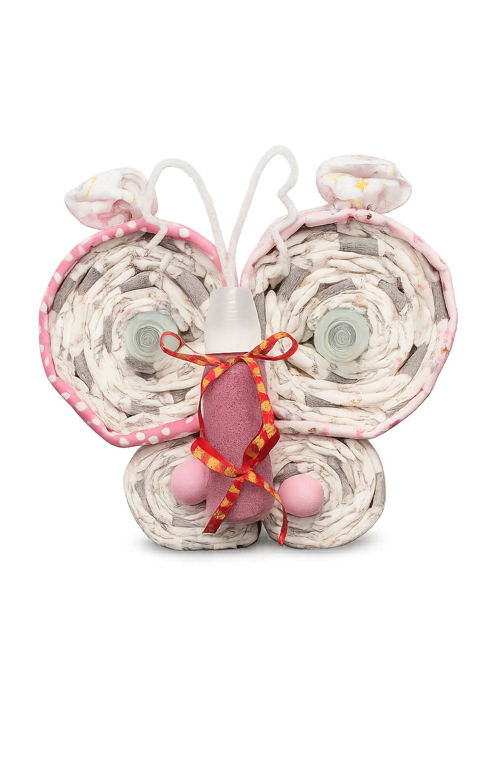 Celebrate a new arrival with this beautiful, handcrafted butterfly-themed diaper cake. Designed with care and attention to detail, this charming creation features soft colors and coordinated baby essentials, making it both a stunning display and a practical gift for new parents.