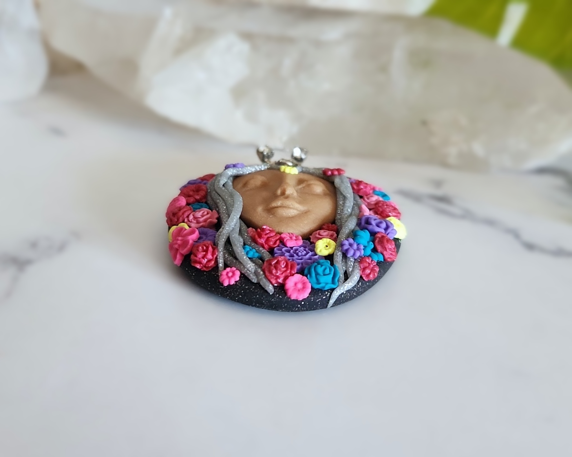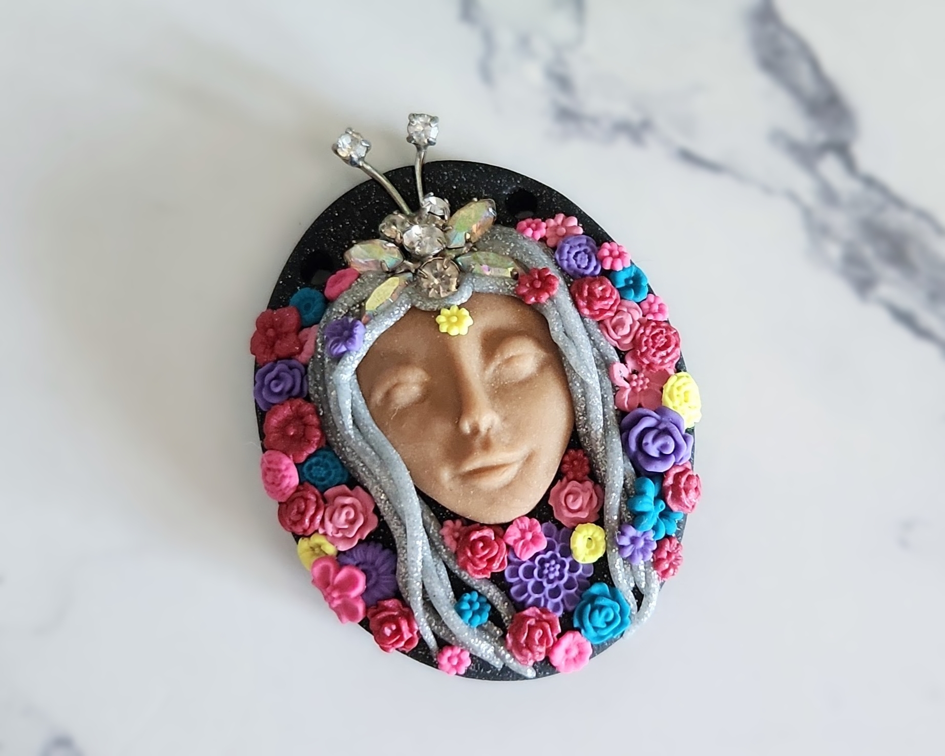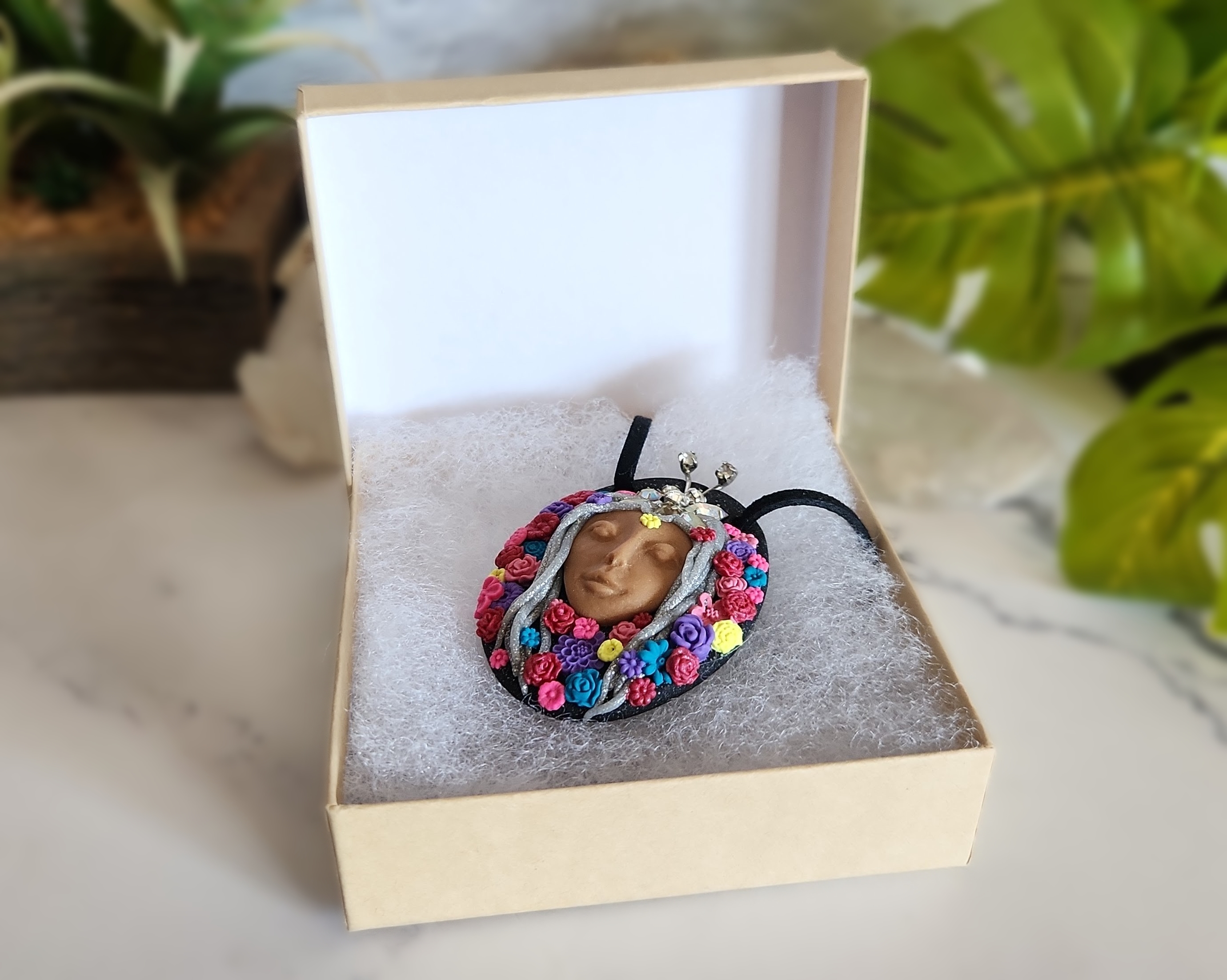 This joyful pendant is bursting with personality, color, and a whole lot of meaning. Measuring 2.4 by 1.73 inches, it’s crafted from Polymer Clay and features an upcycled butterfly component transformed into the crown of a serene “Butterfly Goddess.” Her silver, glitter threaded hair gives her the presence of a wise guardian- someone who has spent a lifetime learning from the butterflies she welcomes and protects.