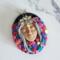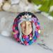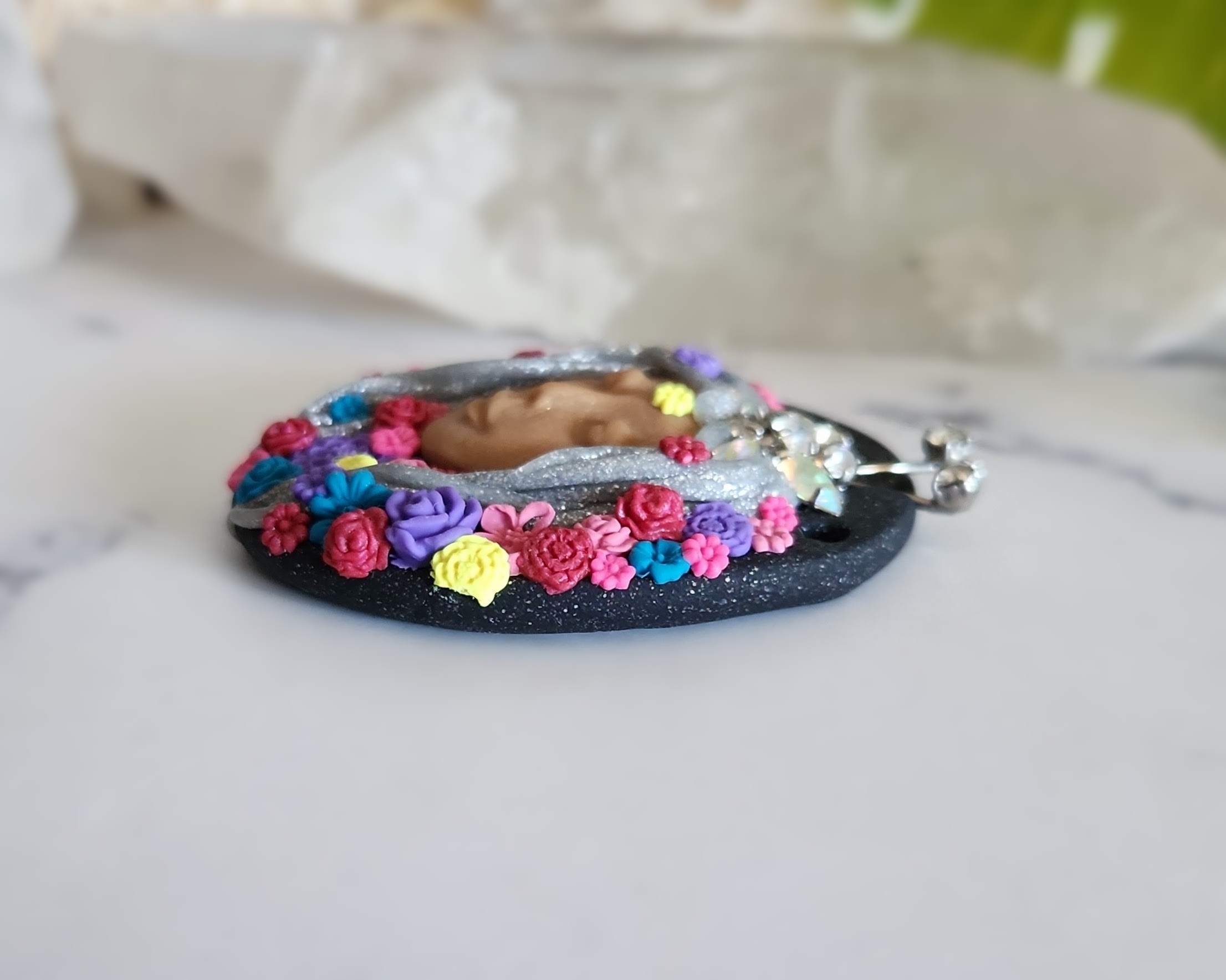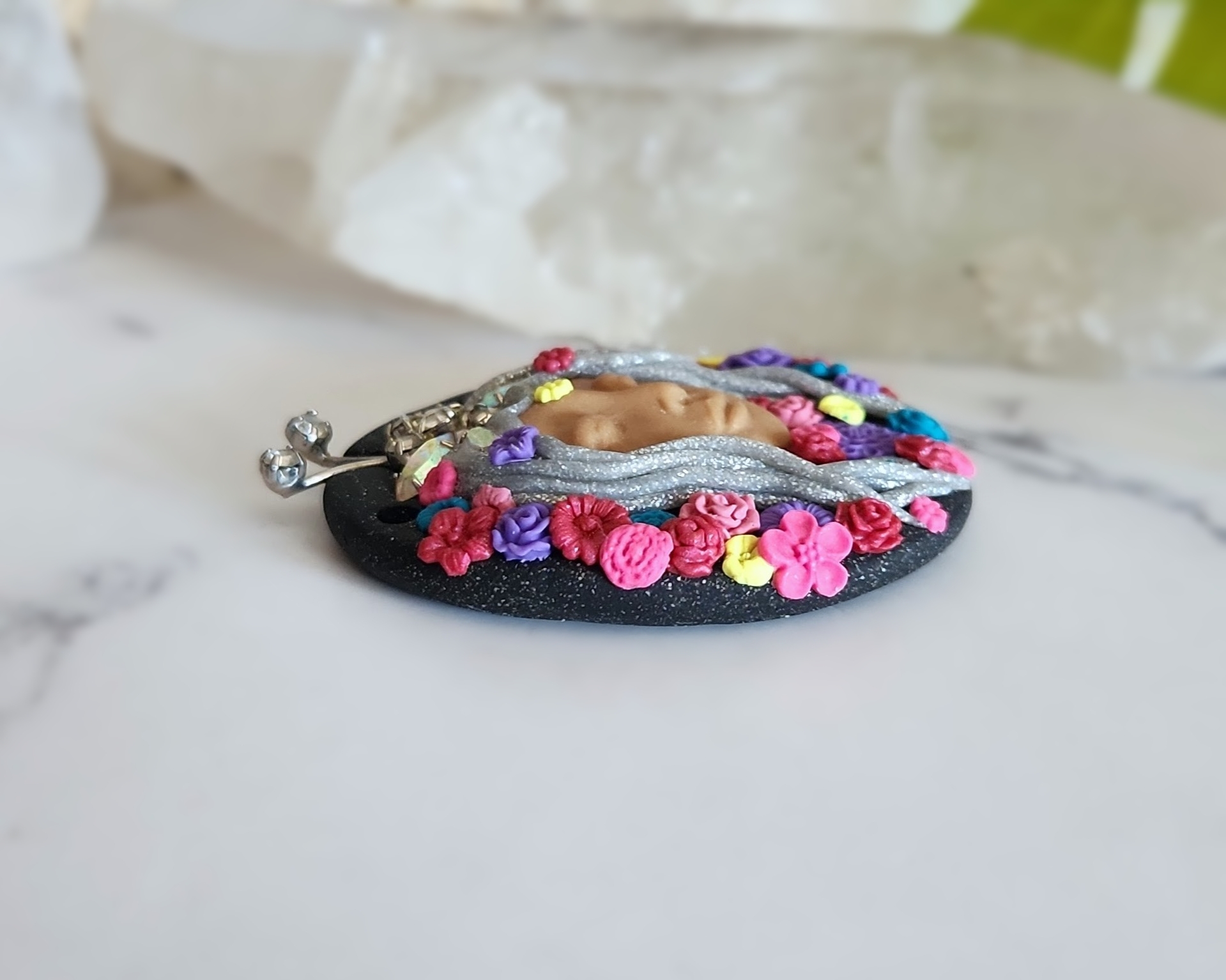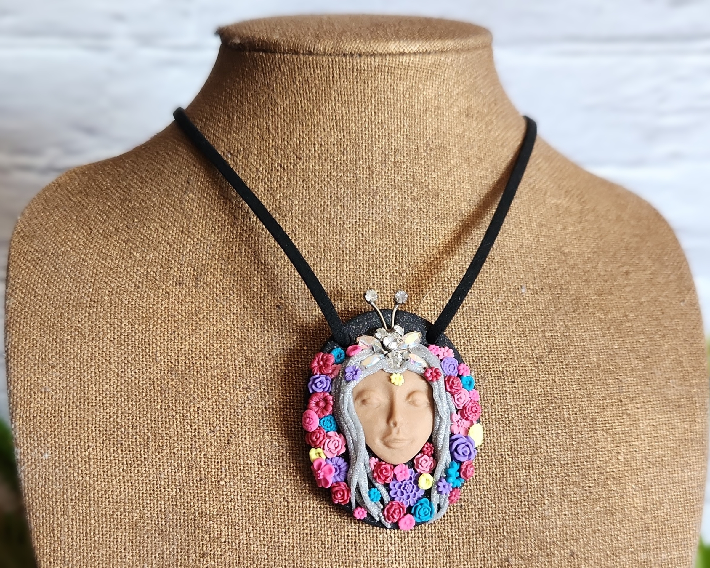 This joyful pendant is bursting with personality, color, and a whole lot of meaning. Measuring 2.4 by 1.73 inches, it’s crafted from Polymer Clay and features an upcycled butterfly component transformed into the crown of a serene “Butterfly Goddess.” Her silver, glitter threaded hair gives her the presence of a wise guardian- someone who has spent a lifetime learning from the butterflies she welcomes and protects.