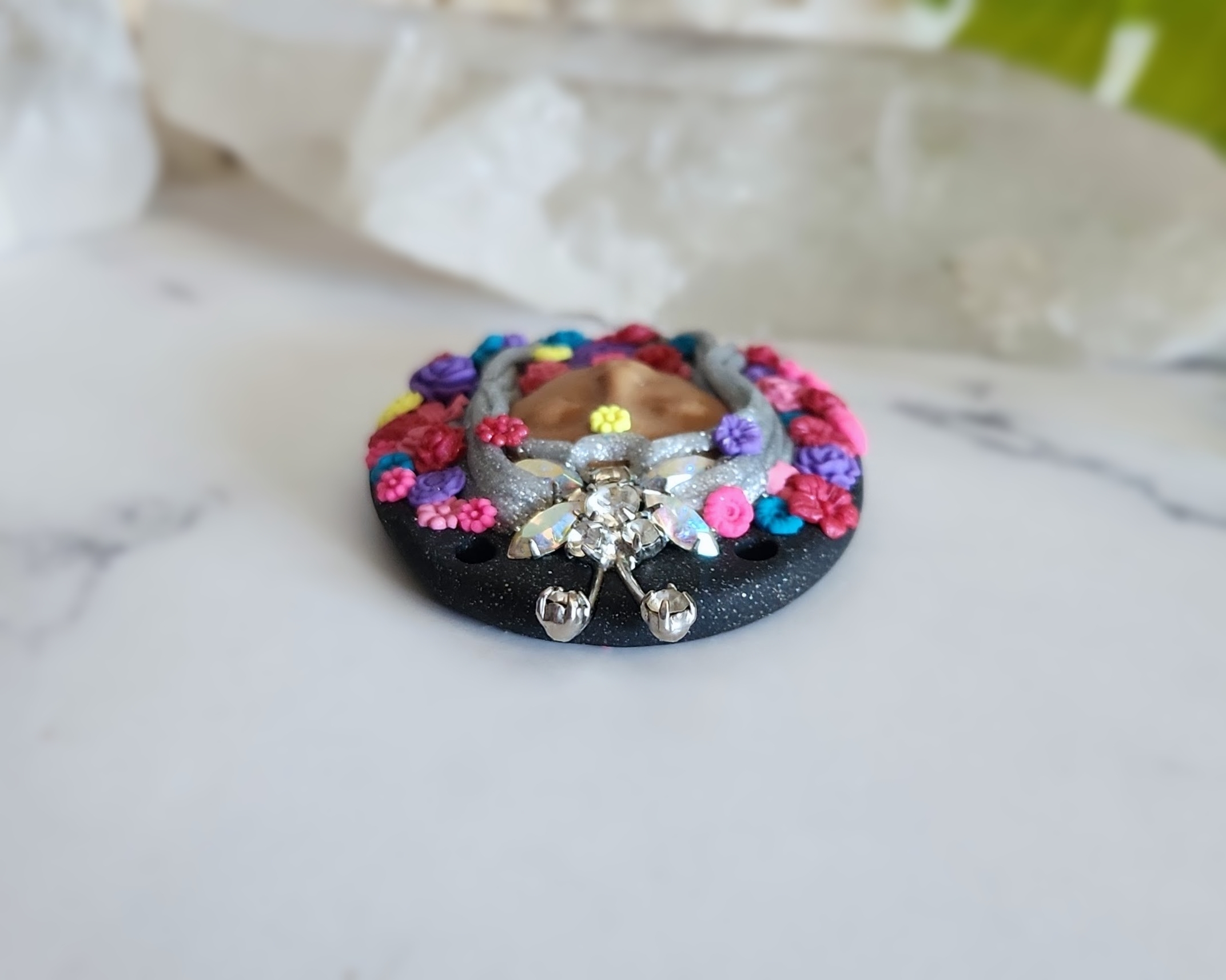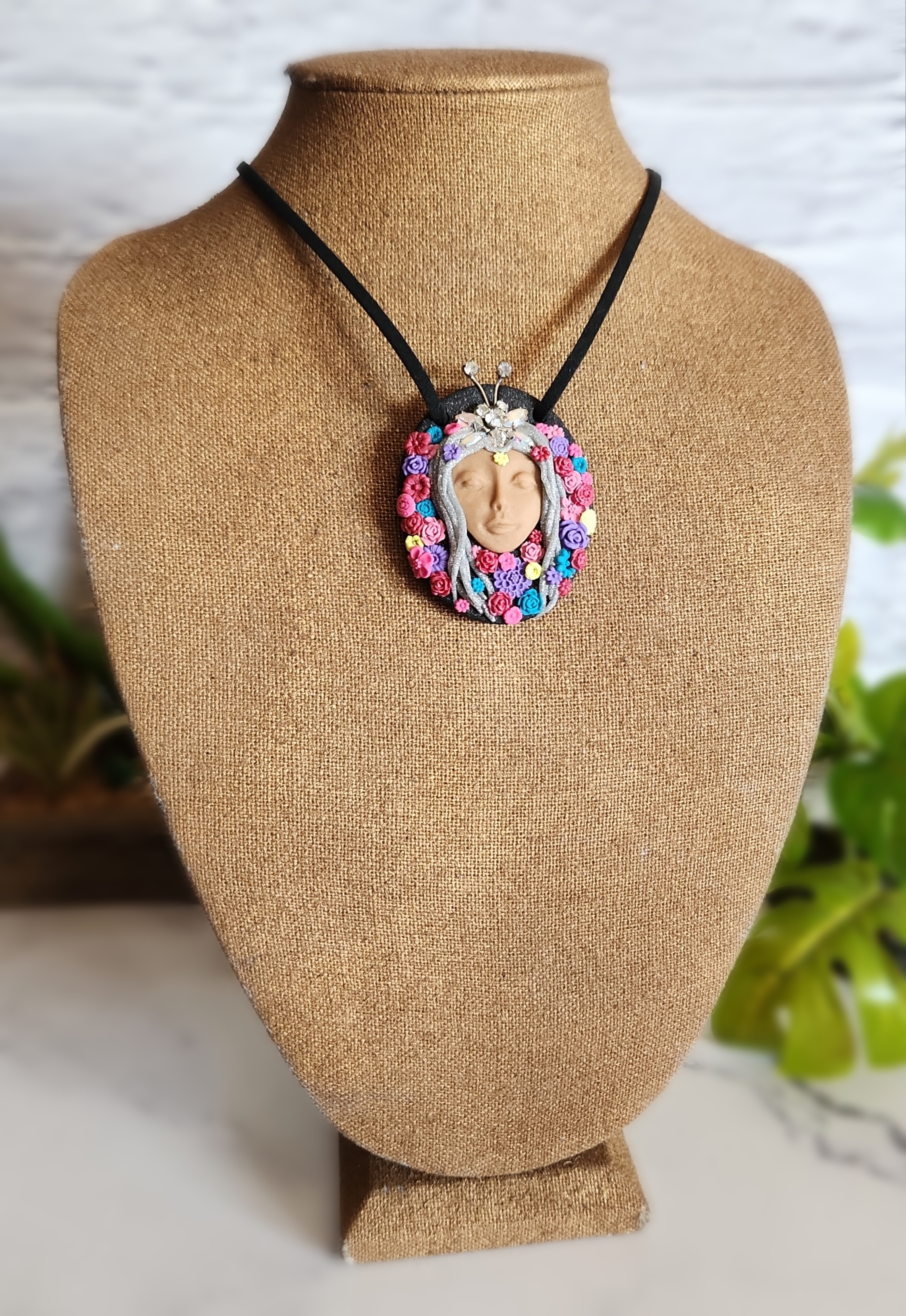 This joyful pendant is bursting with personality, color, and a whole lot of meaning. Measuring 2.4 by 1.73 inches, it’s crafted from Polymer Clay and features an upcycled butterfly component transformed into the crown of a serene “Butterfly Goddess.” Her silver, glitter threaded hair gives her the presence of a wise guardian- someone who has spent a lifetime learning from the butterflies she welcomes and protects.