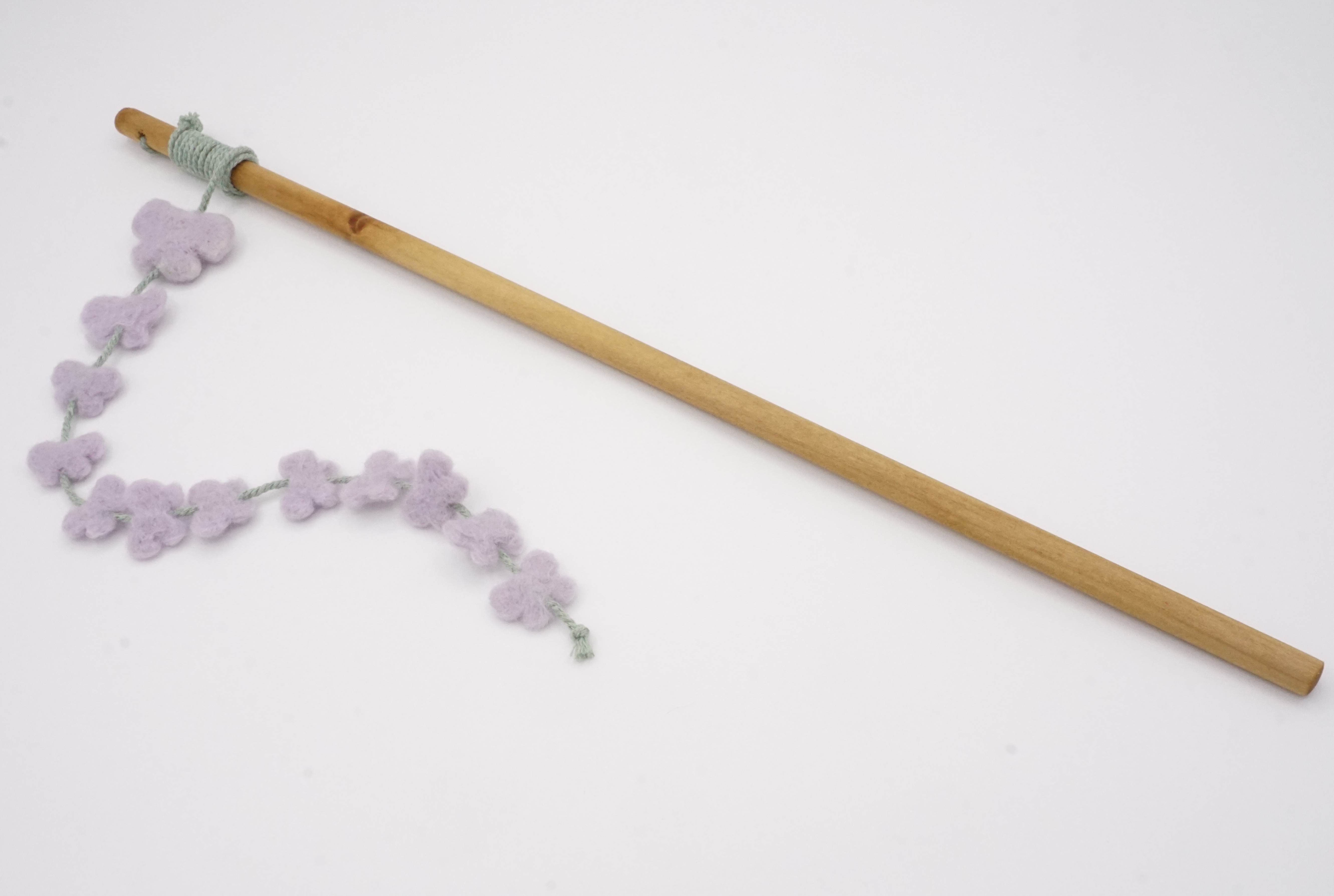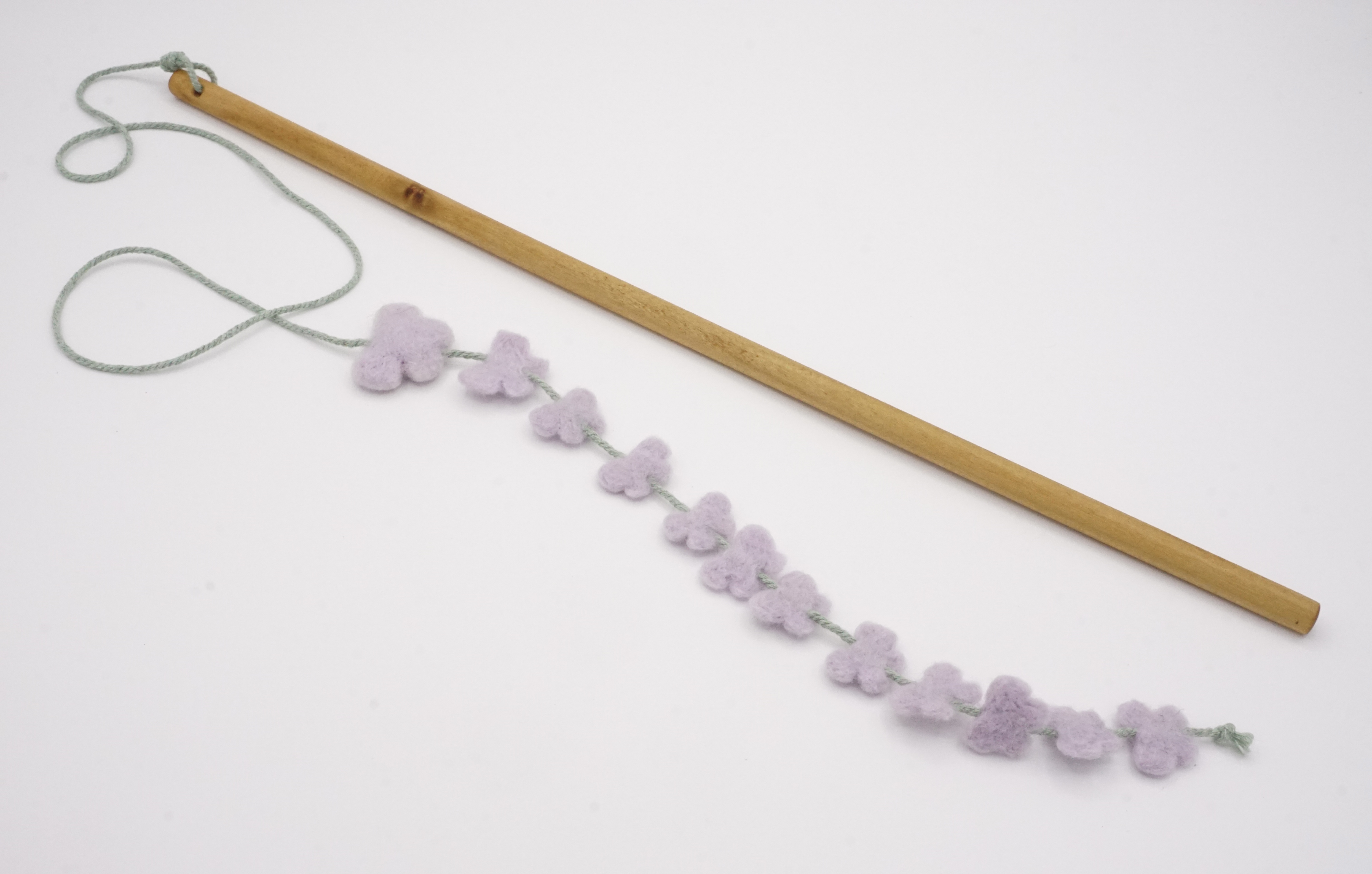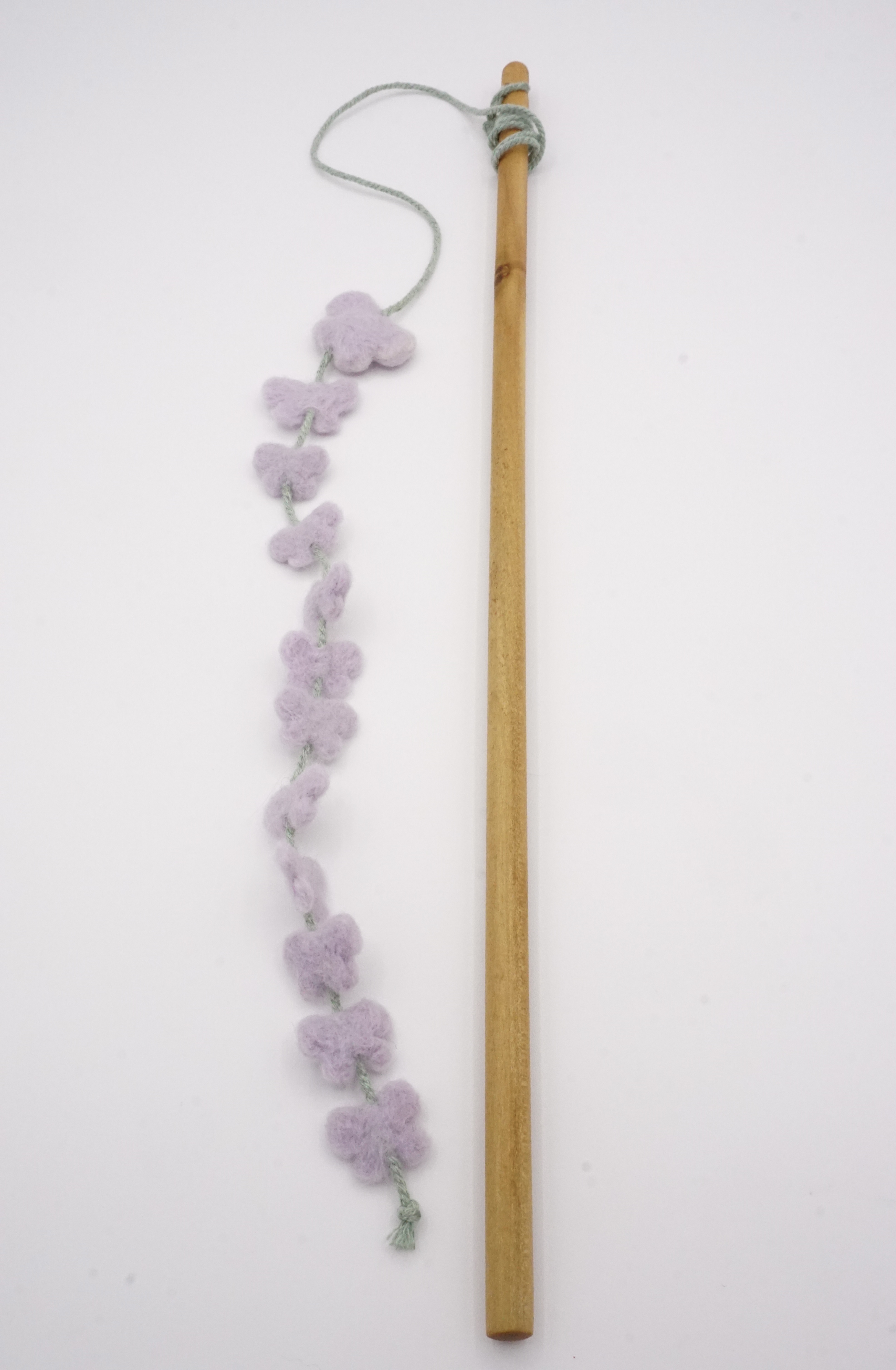 Cats love to pounce and play on toys that resemble prey, that is why I have created this nifty and amusing Butterfly Teaser Toy. Have your cat chase the butterflies by creating movement that resemble them flying in the air or simply dragging the butterflies on the floor or under a blanket, so your cat will find joy in catching them. Each butterfly is individually felted on cotton cording and a jingle bell is placed in one of the butterfles to create sound.