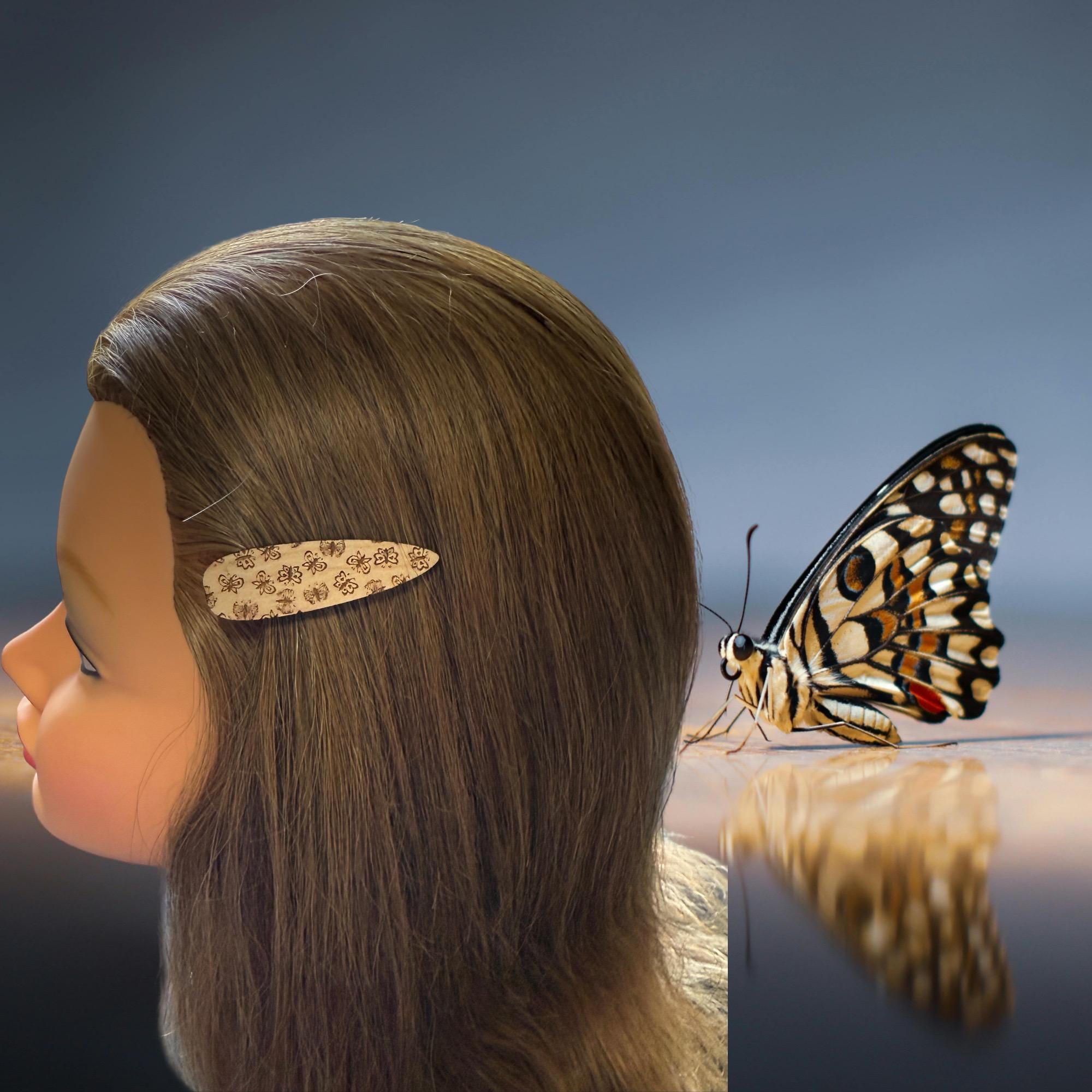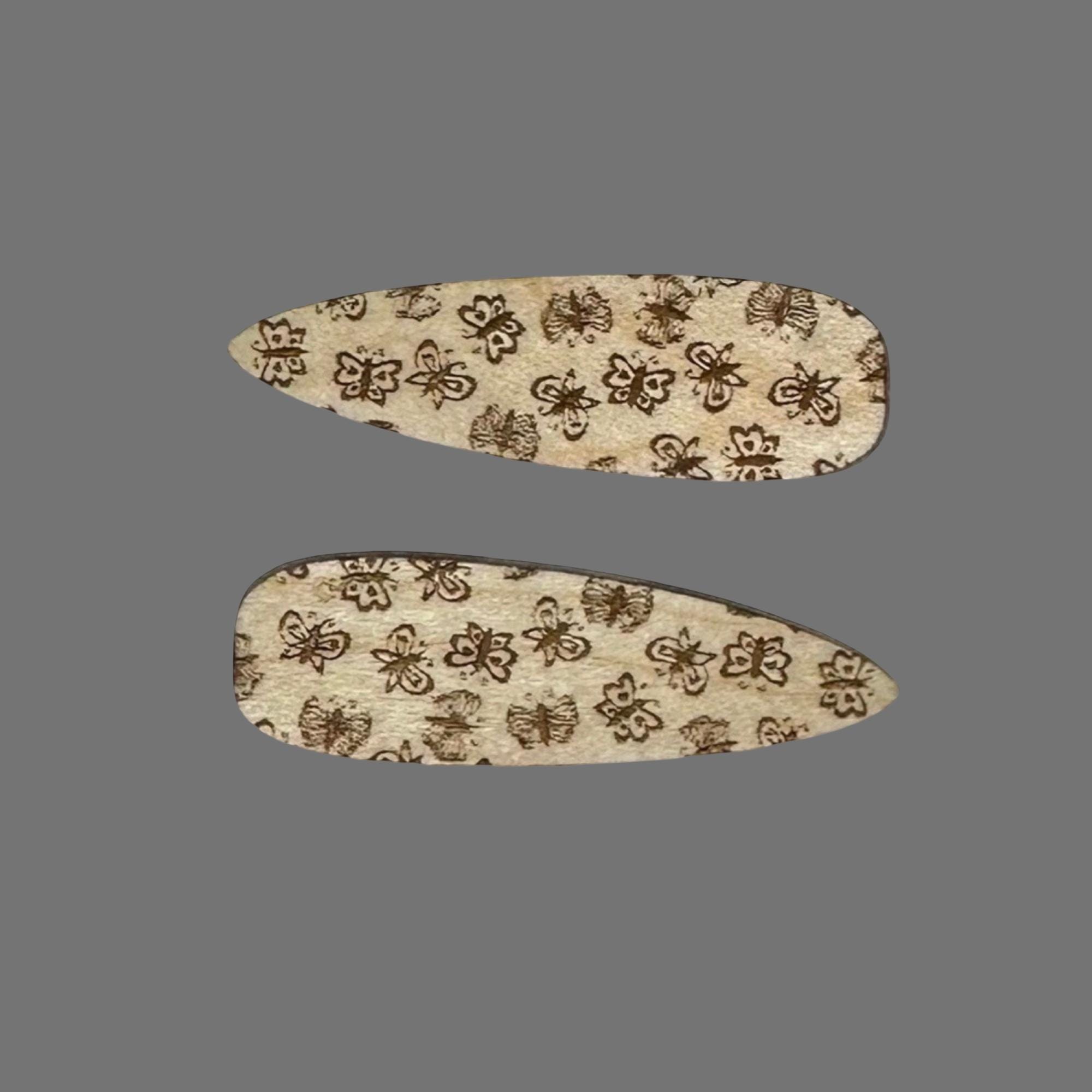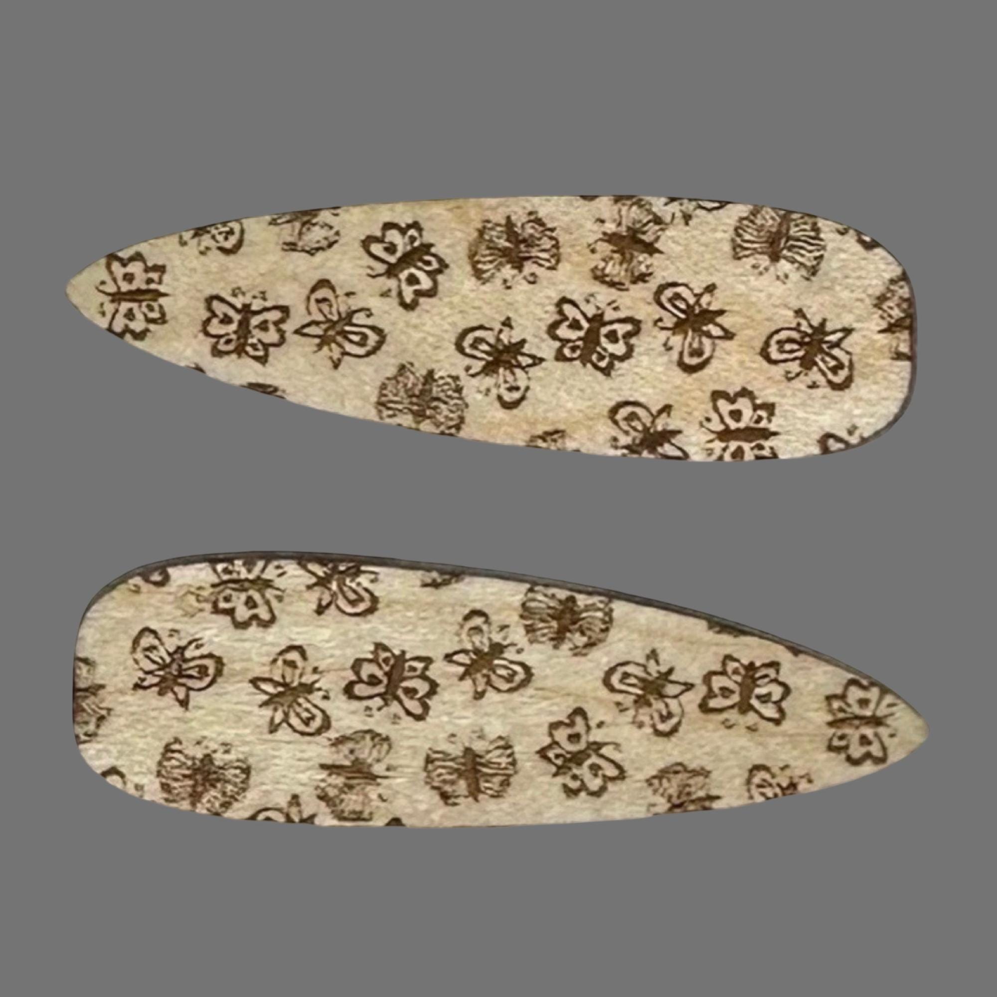 These are a pair of laser cut lightweight butterfly pattern engraved wood hair barrettes. They are made from 1/8 in thick medium maple plywood. They have an alligator clip on them. The clips are nickel plated metal. They are approx. 2” long.
