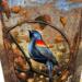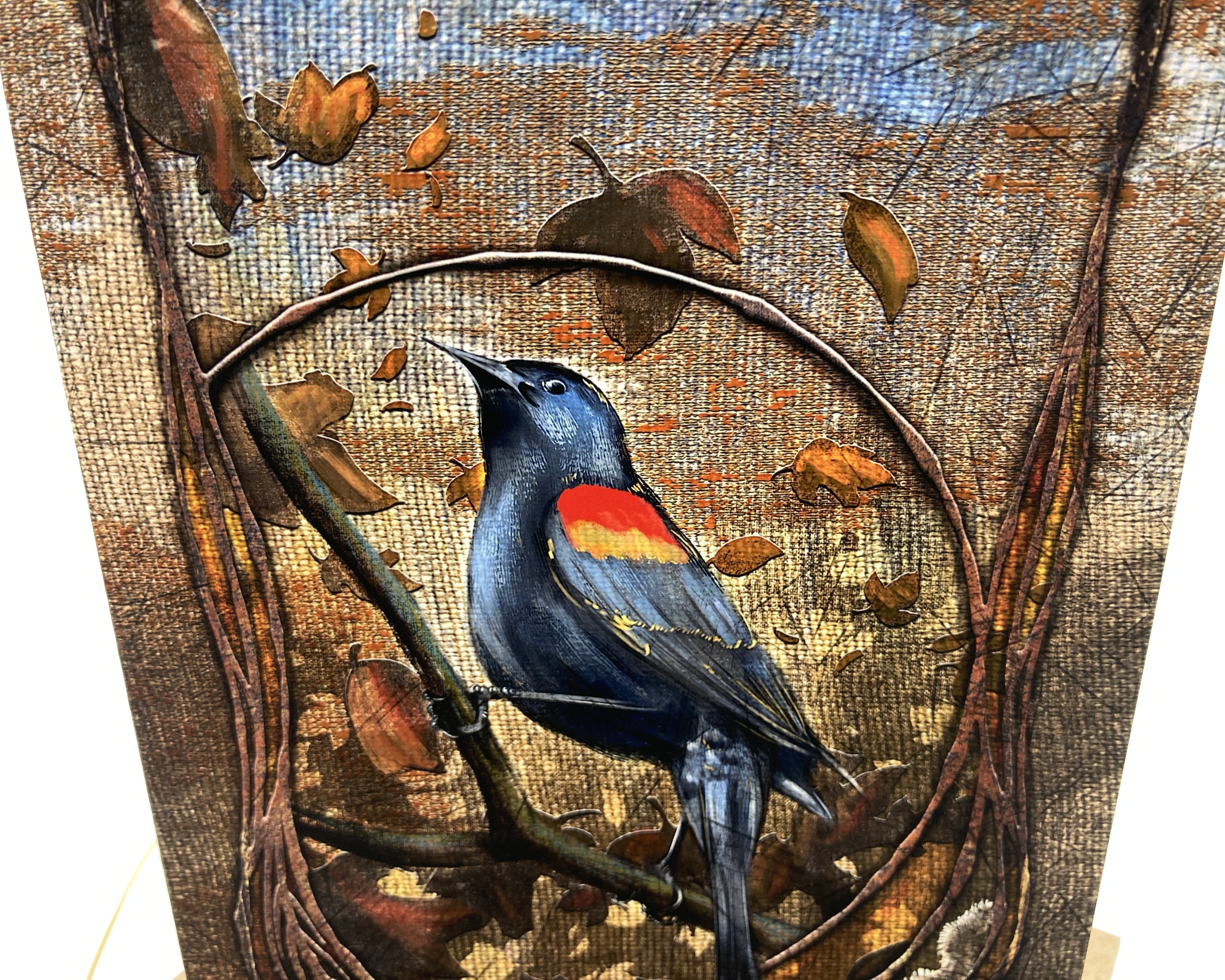 California Brown Pelicans are found throughout the west coast of the United States. Pelicans are sometimes depicted in popular culture as gangly-looking birds with pouch beaks in a comical way. But they can sometimes be quite majestic. This one is framed against a seashore with soft waves and watery grooves in the sand, framed in Art nouveau-styled filigree against a heavy canvas texture.