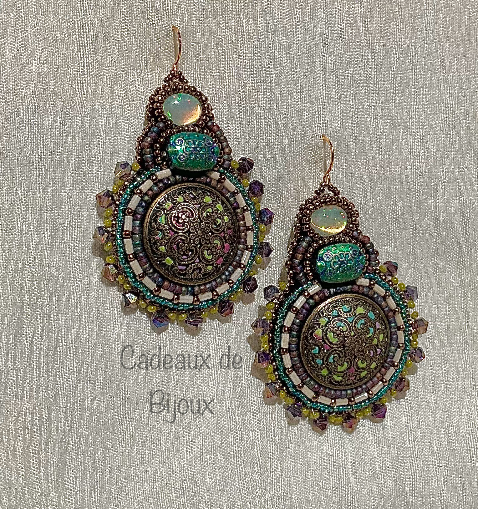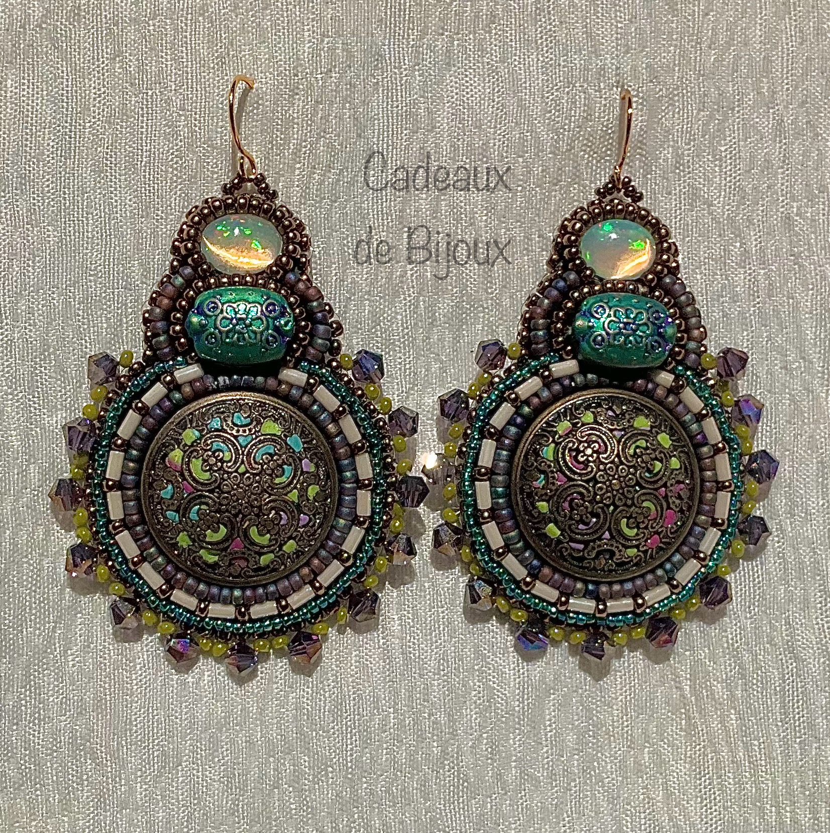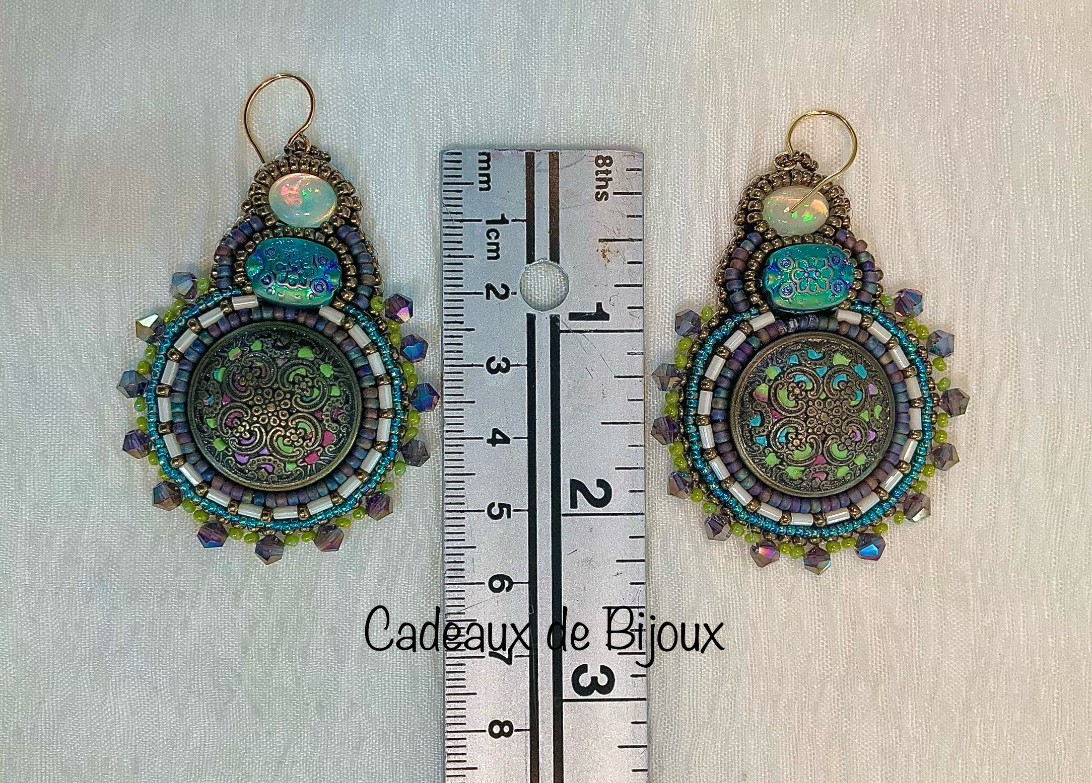 Filigree elegance recalls the ancient Byzantine era with bronze and exotic Ethiopian opals. Specialty openwork buttons are backed with polymer clay in lavender, pink, turquoise and lime colors surrounded with Czech and Japanese beads. Edged with crystal faceted bicone beads for subtle sparkle. 2.25” drop from hypoallergenic ear wires. Surprisingly light at .956g / .337oz.