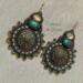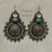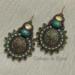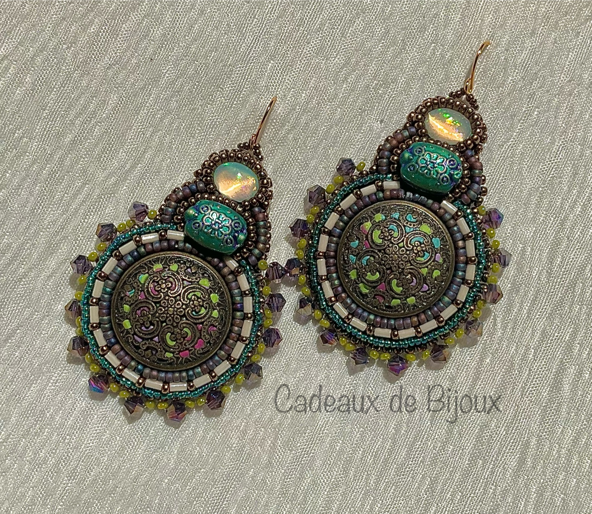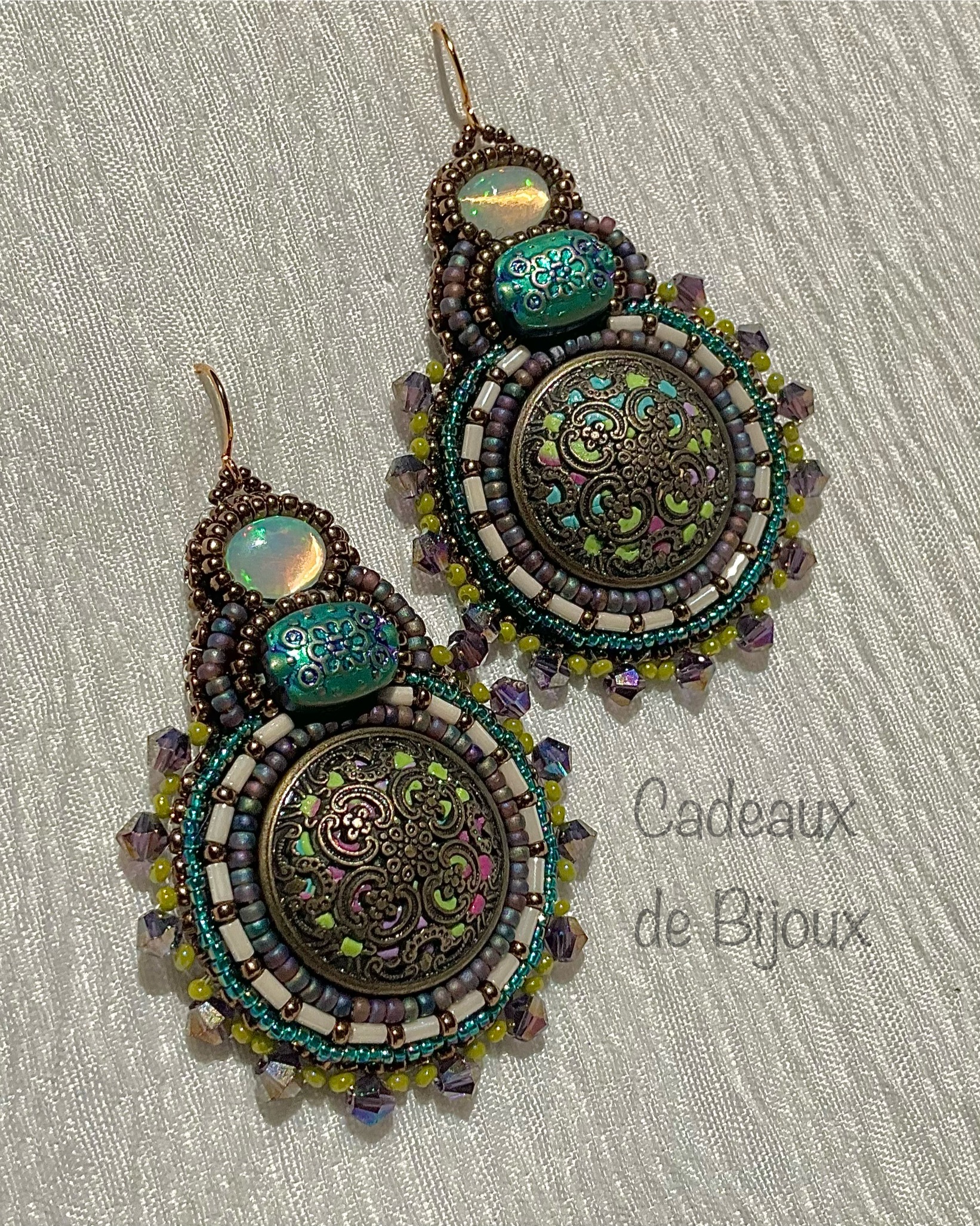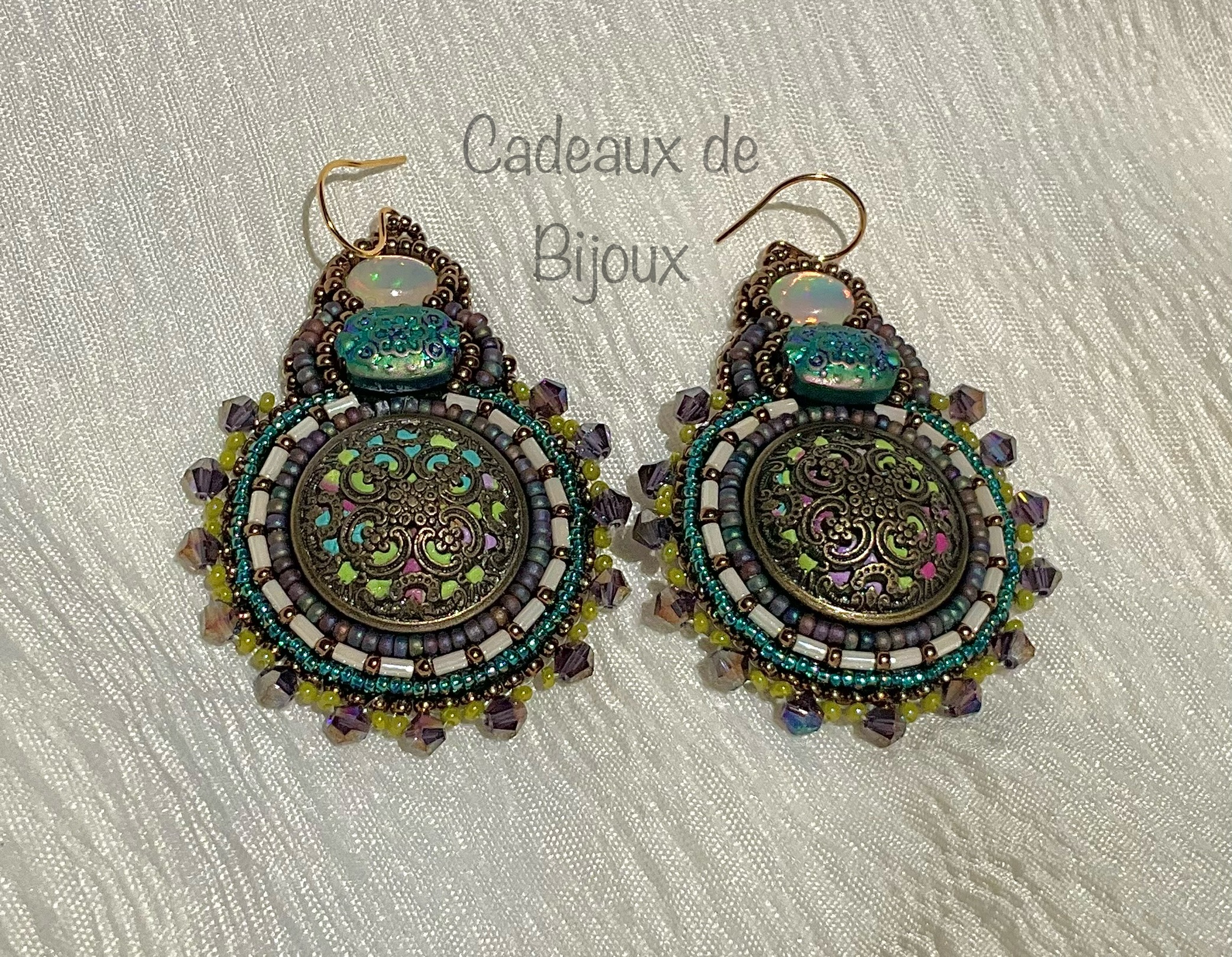 Filigree elegance recalls the ancient Byzantine era with bronze and exotic Ethiopian opals. Specialty openwork buttons are backed with polymer clay in lavender, pink, turquoise and lime colors surrounded with Czech and Japanese beads. Edged with crystal faceted bicone beads for subtle sparkle. 2.25” drop from hypoallergenic ear wires. Surprisingly light at .956g / .337oz.