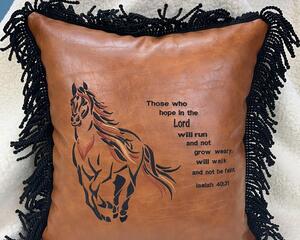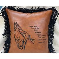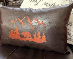 The embroidered elk pillow reflects a peaceful mountain scene. Choose a light, floral fabric appliqued at the corners to imitate a window to view the woodland scene through. The embroidery thread used is stain resistant and will last for many years to come. The high quality of the faux leather we use guarantees that this pillow can be wiped clean with a damp cloth and has a long lasting reputation.