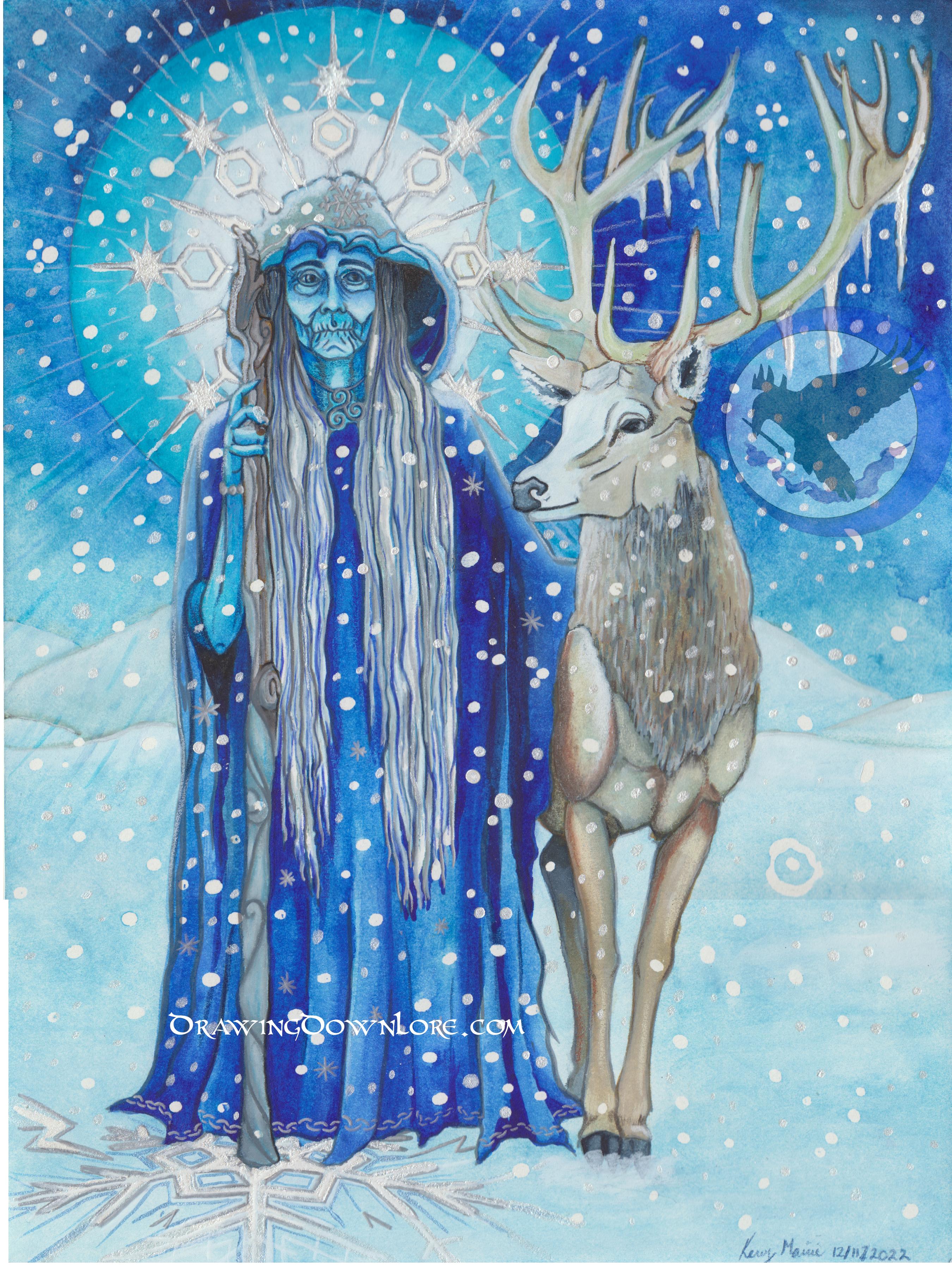 This is the second piece in my series Christmas Creatures and Yuletide Spirits. This print features Grandma Cailleach. Cailleach is the Goddess of Winter and the Wild. She herds deer, raises storms, and freezes the ground with her staff.