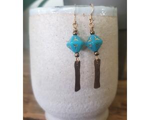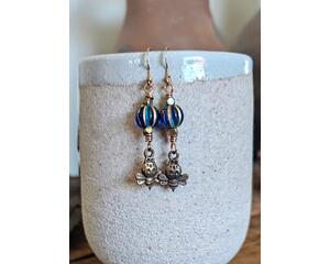 Sweet Bronze Bee Charm & Blue Czech Glass Dangle Earrings – ...