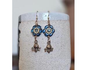 Whimsical Bronze Bee Earrings with Blue & Gold Czech Glass Fl...