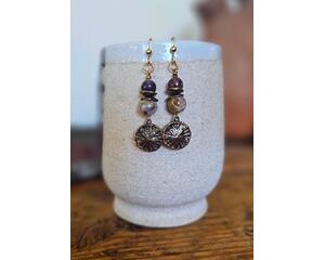 Gold Bronze Textured Disc Earrings with Phosphosiderite Beads...