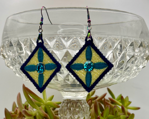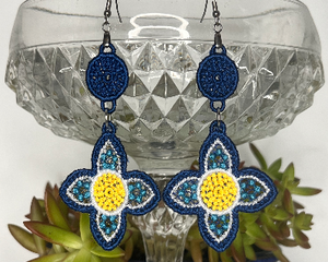 Freestanding lace is made from a machine embroidered design, usually comprised of lace fill stitches and satin stitch outlines that hold the lace together and finish the edges so the finished piece can stand alone. I take the time to pick out complimentary colors and set up the machine. After stitching I take time to trim and make the earring look great. Then I add hypoallergenic findings to each earring to complete the set.