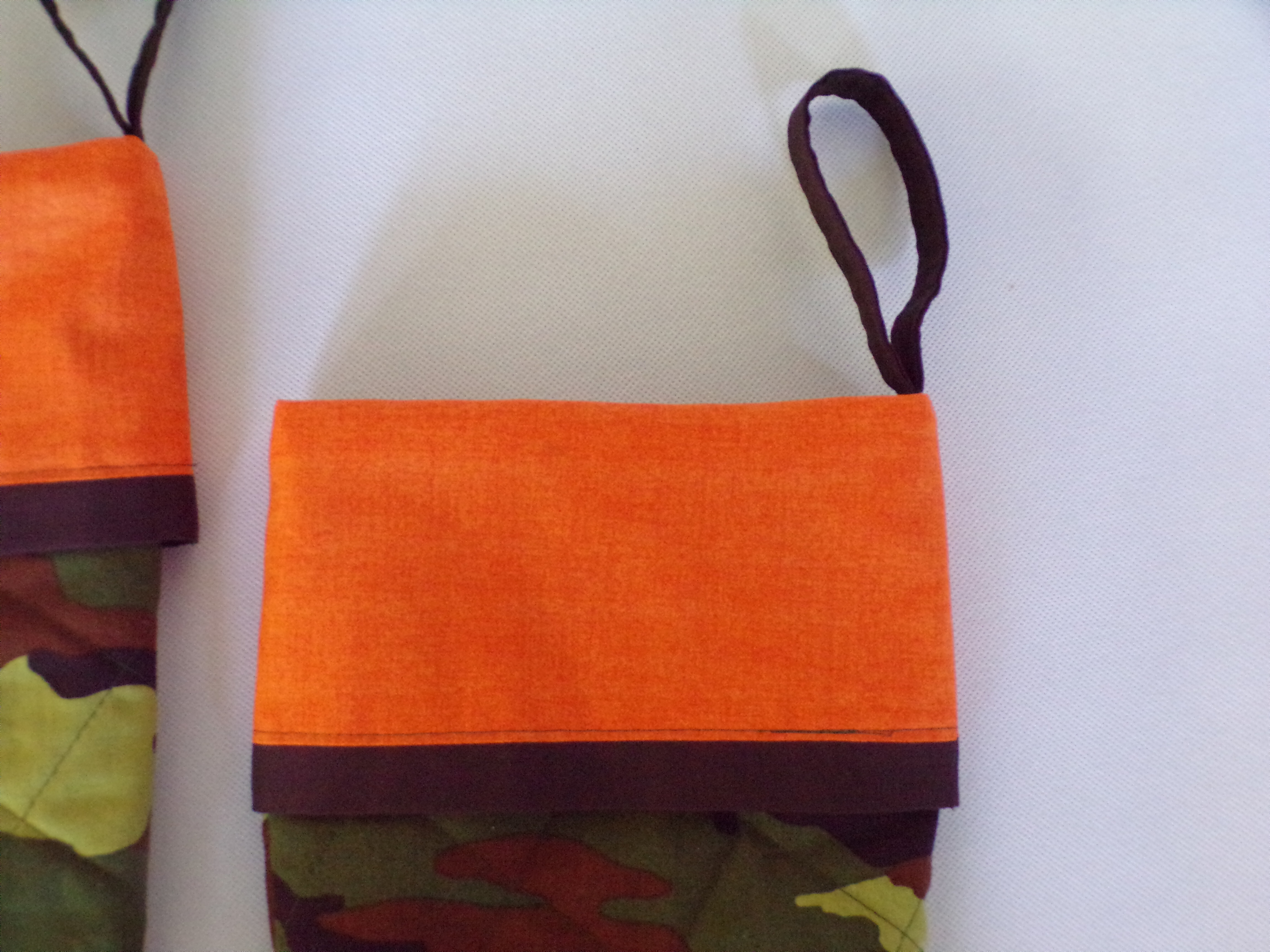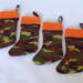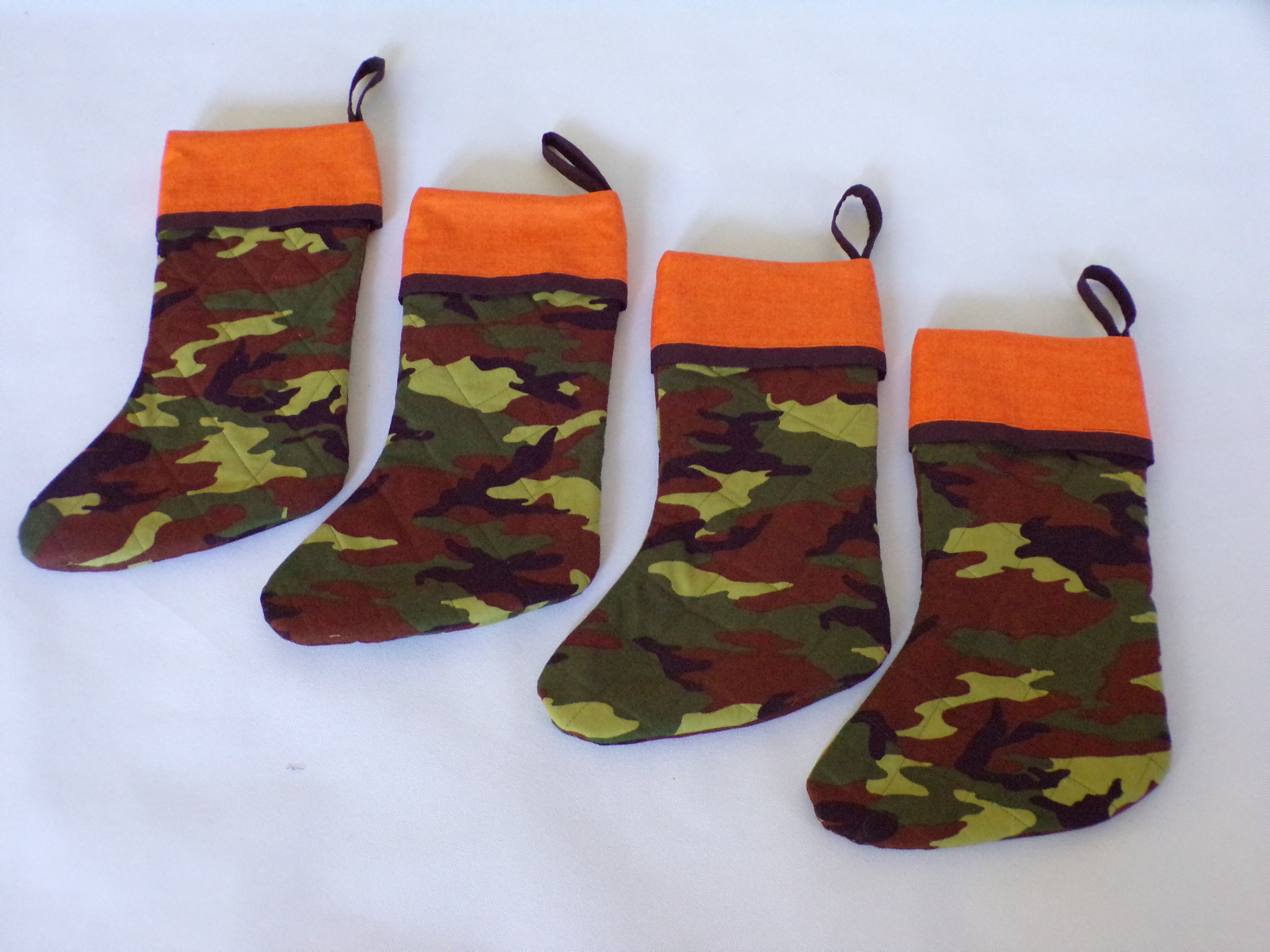 Camo quilted stockings come in a set of four. Stockings are 18 inches long with a four- and 1/2-inch orange cuff hang over. Stocking measures 10 1/4 inches across at foot. Fabric hanger is sewn in. Measurements are approximate. Stockings are lined with white and black gingham fabric, quilted and topstitched with green thread. Stockings have not been prewashed and may shrink if washed. Please use a mild detergent, cold water, and a color catcher to wash, and dry on low heat. Only one set is available.